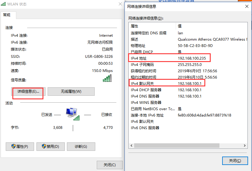 2) 雙擊該網卡,顯示詳細信息,查看電腦獲取的IP