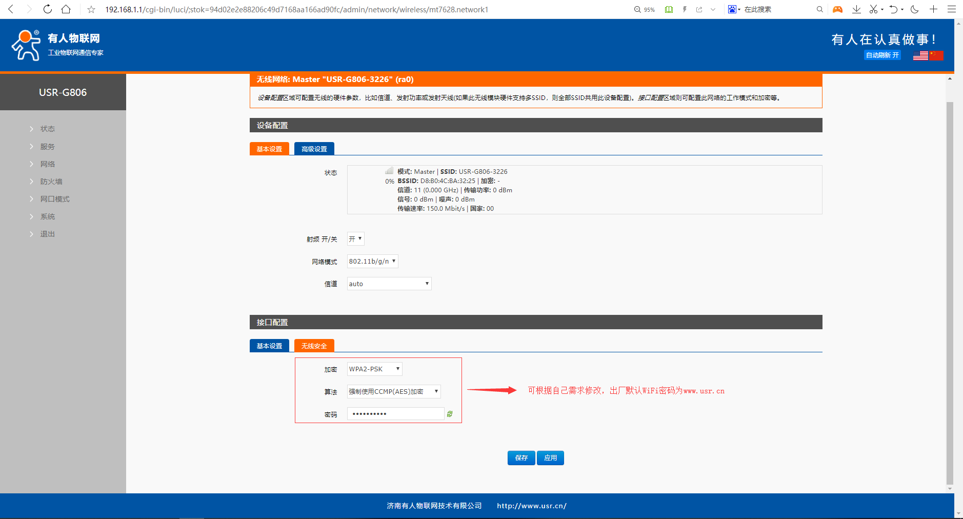 5、 在接口配置---無線安全中可以修改該WiFi的加密方式,默認加密方式為WPA2-PSK,默認密碼為m.0575400.com
