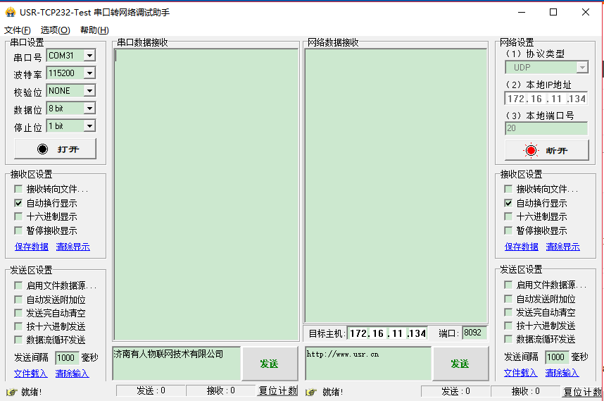 打開USR-TCP232-Test串口轉網絡調試助,下載地址http://m.0575400.com/Download/27.html