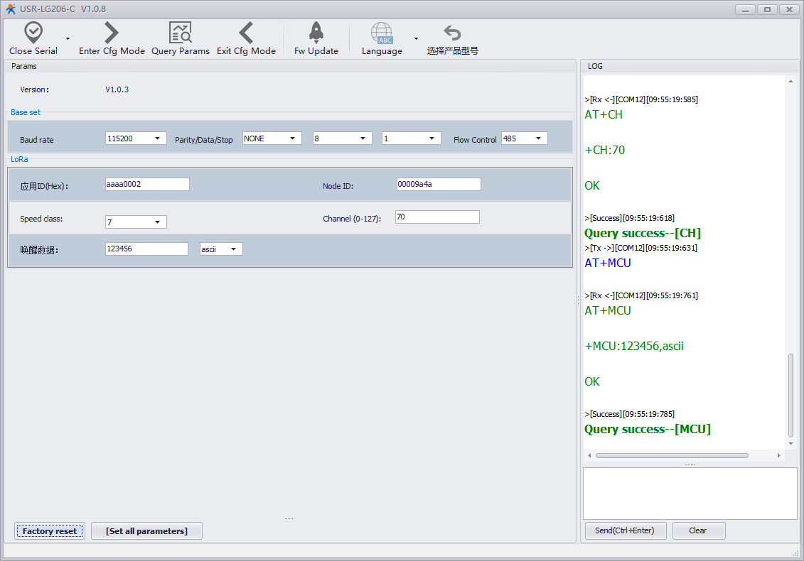 這里以有人LoRa終端USR-LG206-L-C為例。使用串口線連接LoRa終端的RS232接口與電腦,打開USR_LoRa軟件(http://m.0575400.com/Down/USR_LoRa_SET-V1.0.8.rar),選擇LG206-C。