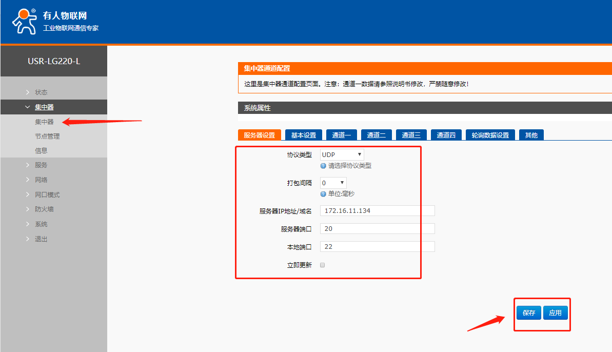 (5)設置集中器的信道和速率,依次點擊集中器,通道一設置速率和信道和lora相同,點擊保存應用,通道二、三、四中設置的速率與信道各不相同,且都與通道一不同。