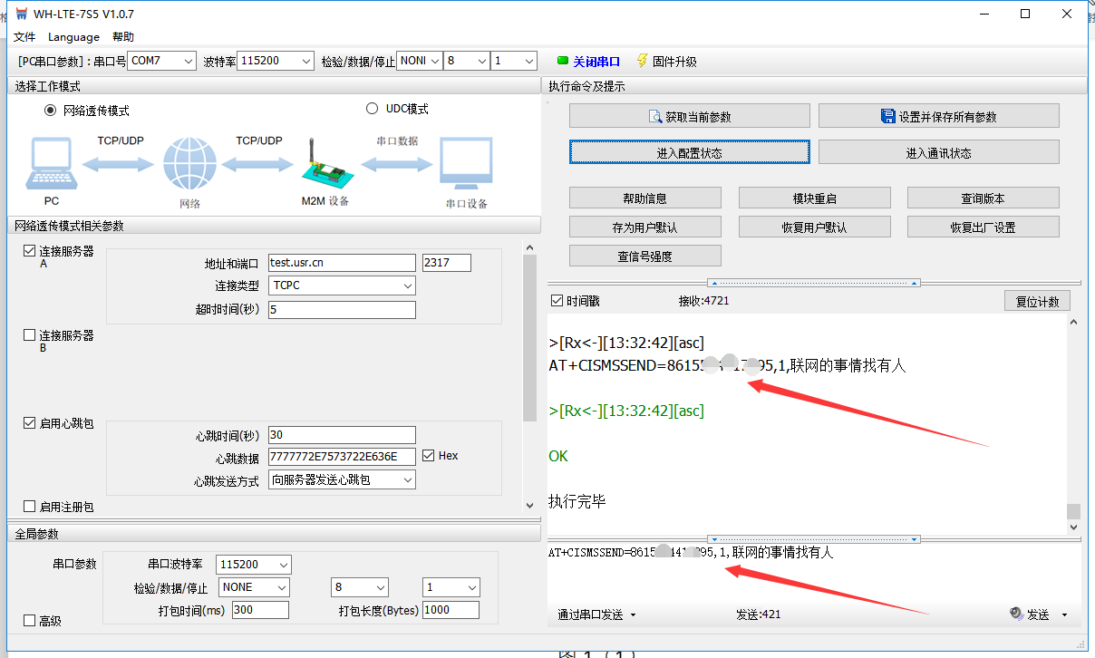 1.4g模塊7s5上電,串口與電腦連接,放入sim卡,(注:物聯卡不能發短信),點擊打開串口,點擊進入配置狀態,返回ok表示進入配置狀態,發送如下指令:AT+CISMSSEND=8613854123456,1,聯網的事情找有人,按回車,然后點擊發送按鈕,此時可以在接收端看到這條短信如圖1(2)。