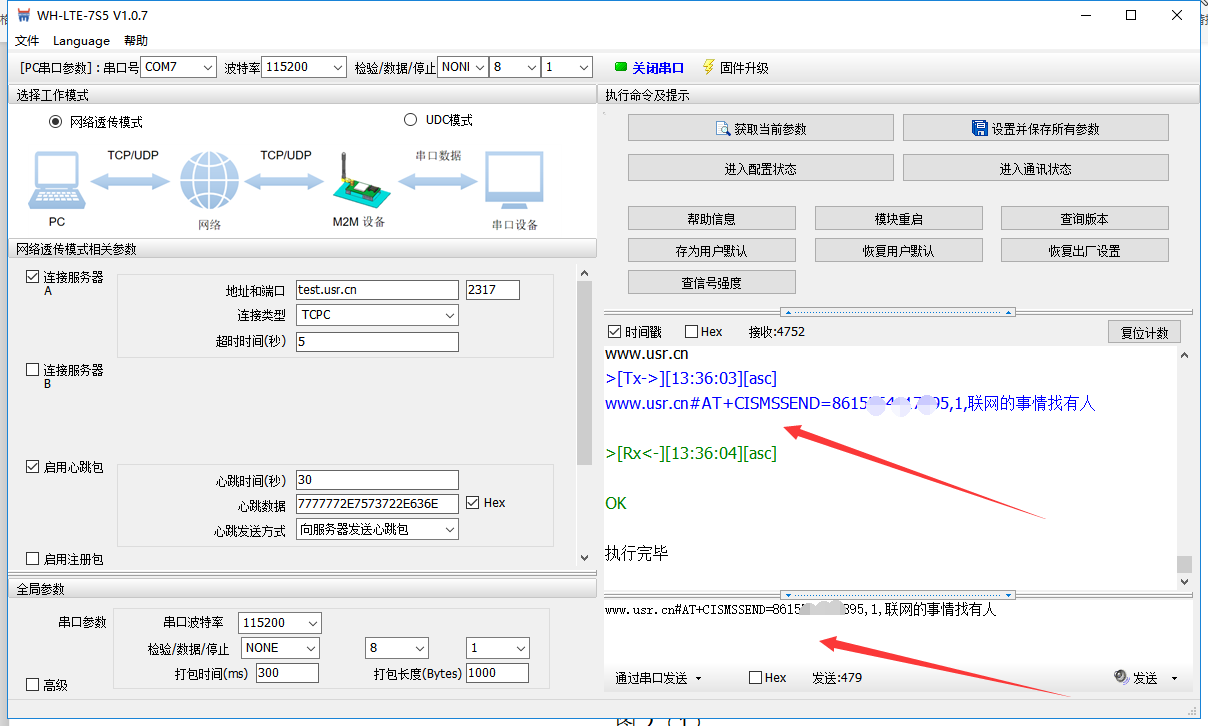2.或者直接使用串口AT指令發送格式(命令密碼加at指令,可在正常通信狀態下發送短信)如下圖: