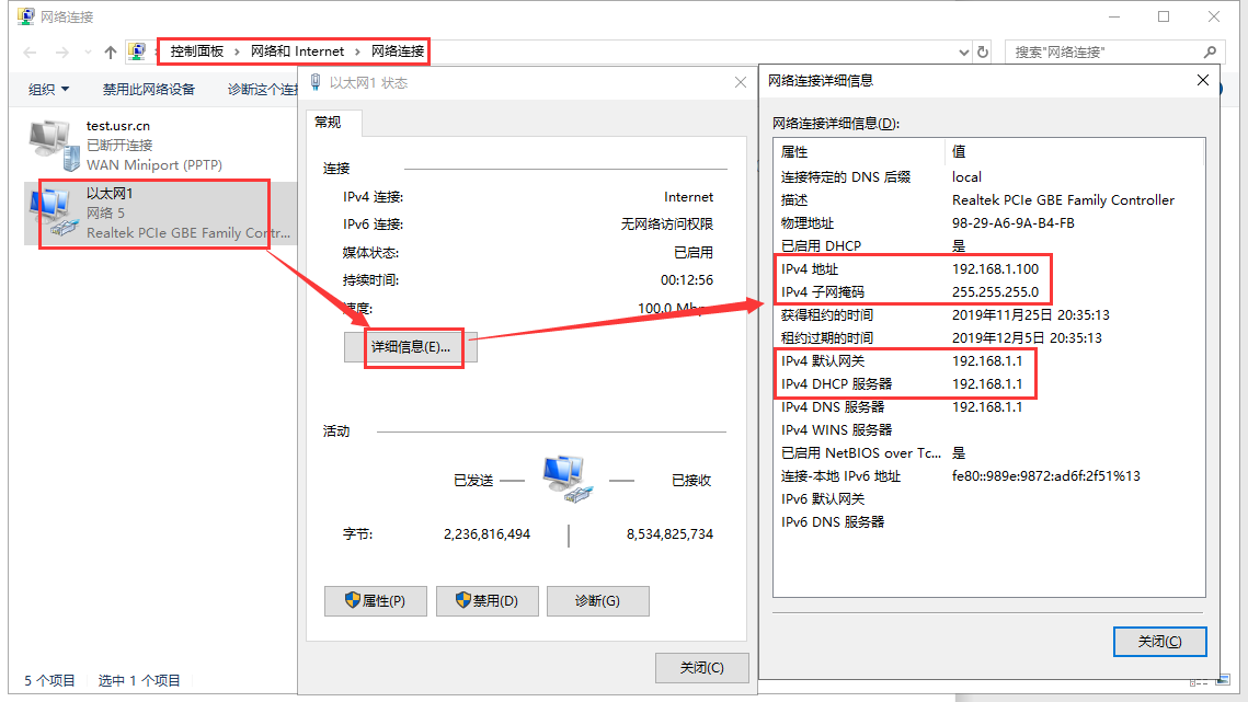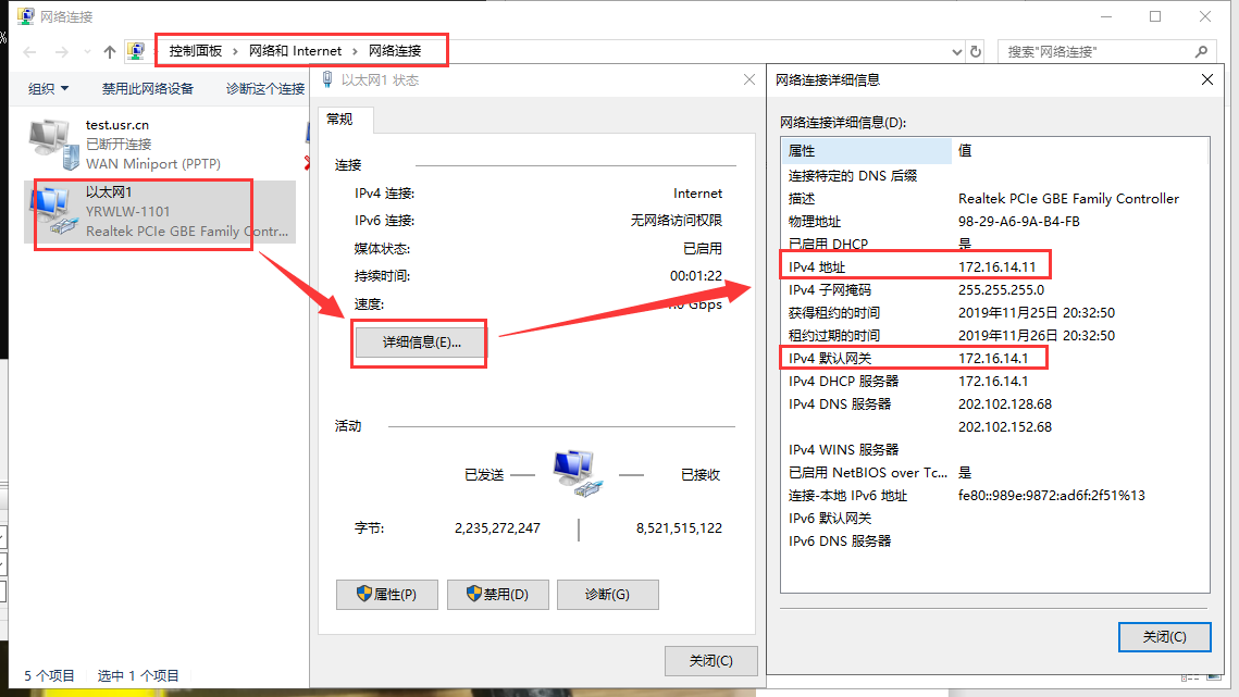 1、有線網線連接PC,在控制面板中打開網卡的詳細信息,查看一下獲取的IP是哪個網段的,G781的LAN口IP出廠默認192.168.1.1,如果該有線網的網段和G781的LAN口網段在同一網段,需要先修改一下G781的LAN口網段或者先修改一下該網線的IP網段,排除IP沖突。