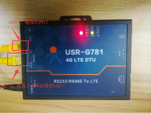 2、如下,有線網線連接G781的WAN/LAN口,PC網口連接G781的LAN口,給設備上電,待work指示燈1s間隔閃爍,則設備啟動完成。