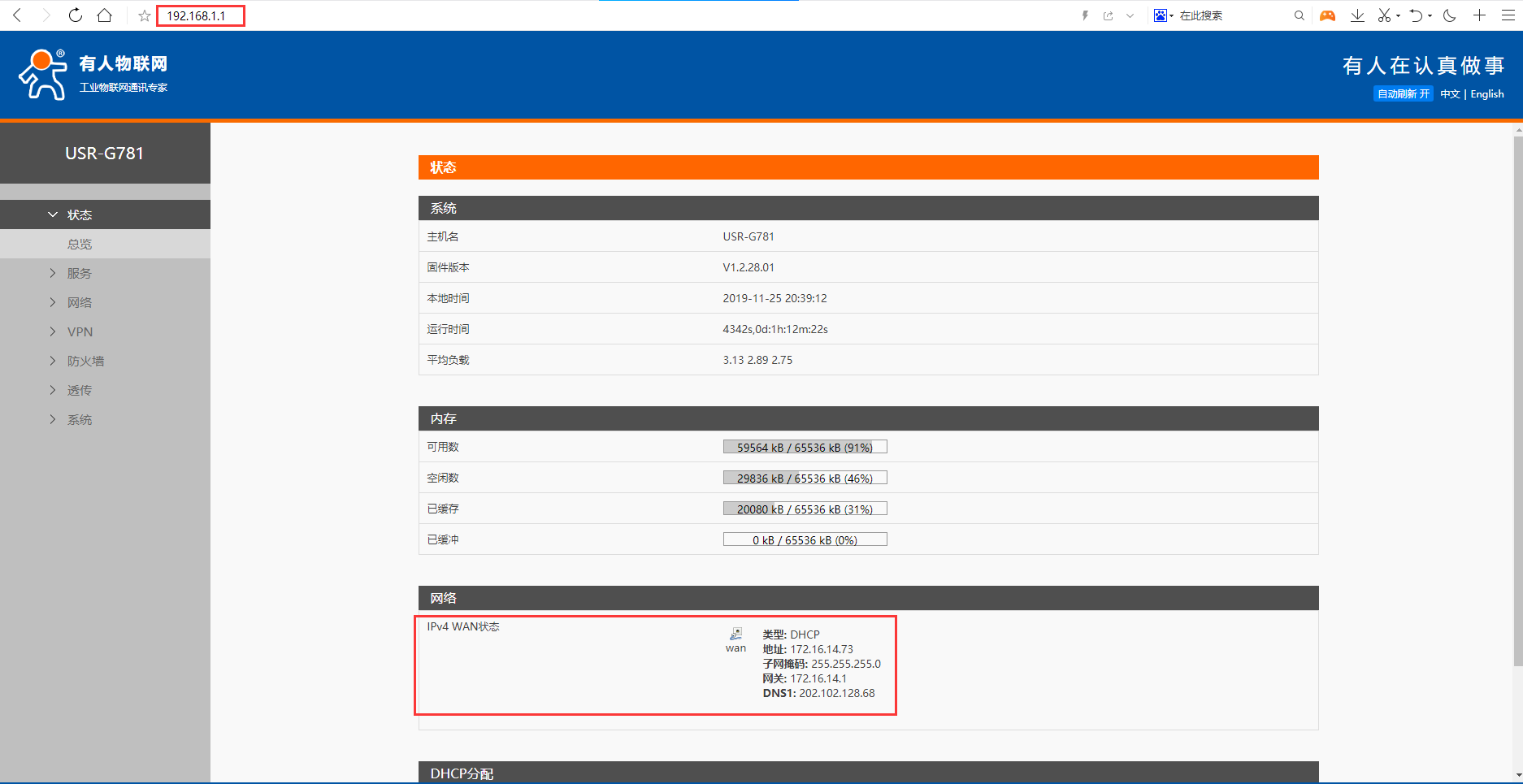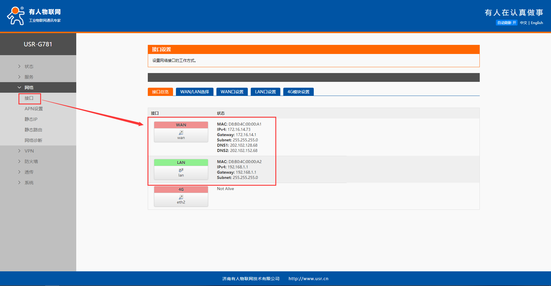 2、瀏覽器地址欄輸入192.168.1.1進入G781的內置網頁,可以在狀態總覽界面看到G781WAN口獲取到了IP,也可以在網絡---接口界面查看接口IP信息