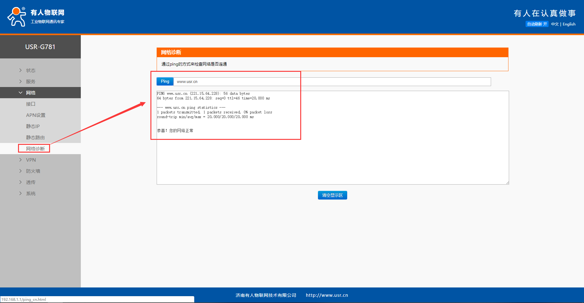 在G781的網絡---網絡診斷界面,ping外網IP試一下,如下網絡正常: