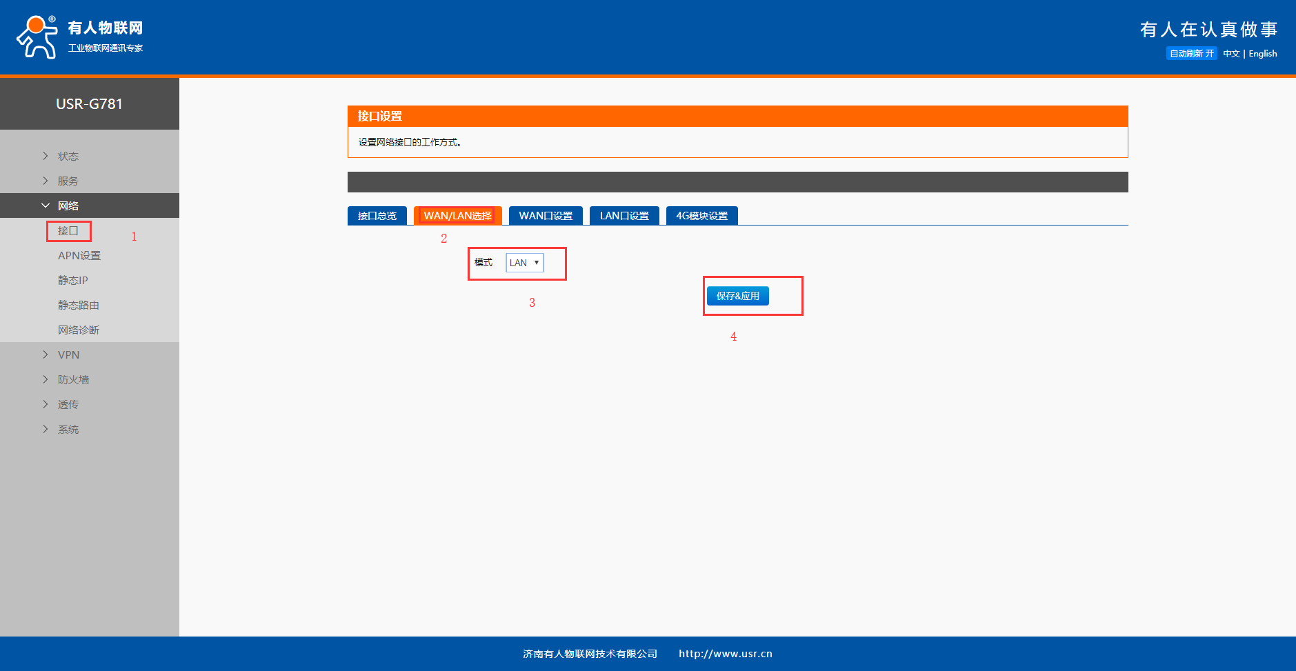2、進入網絡---接口界面。點擊WAN/LAN選擇,出廠默認WAN模式,可以修改為LAN模式,然后點擊應用