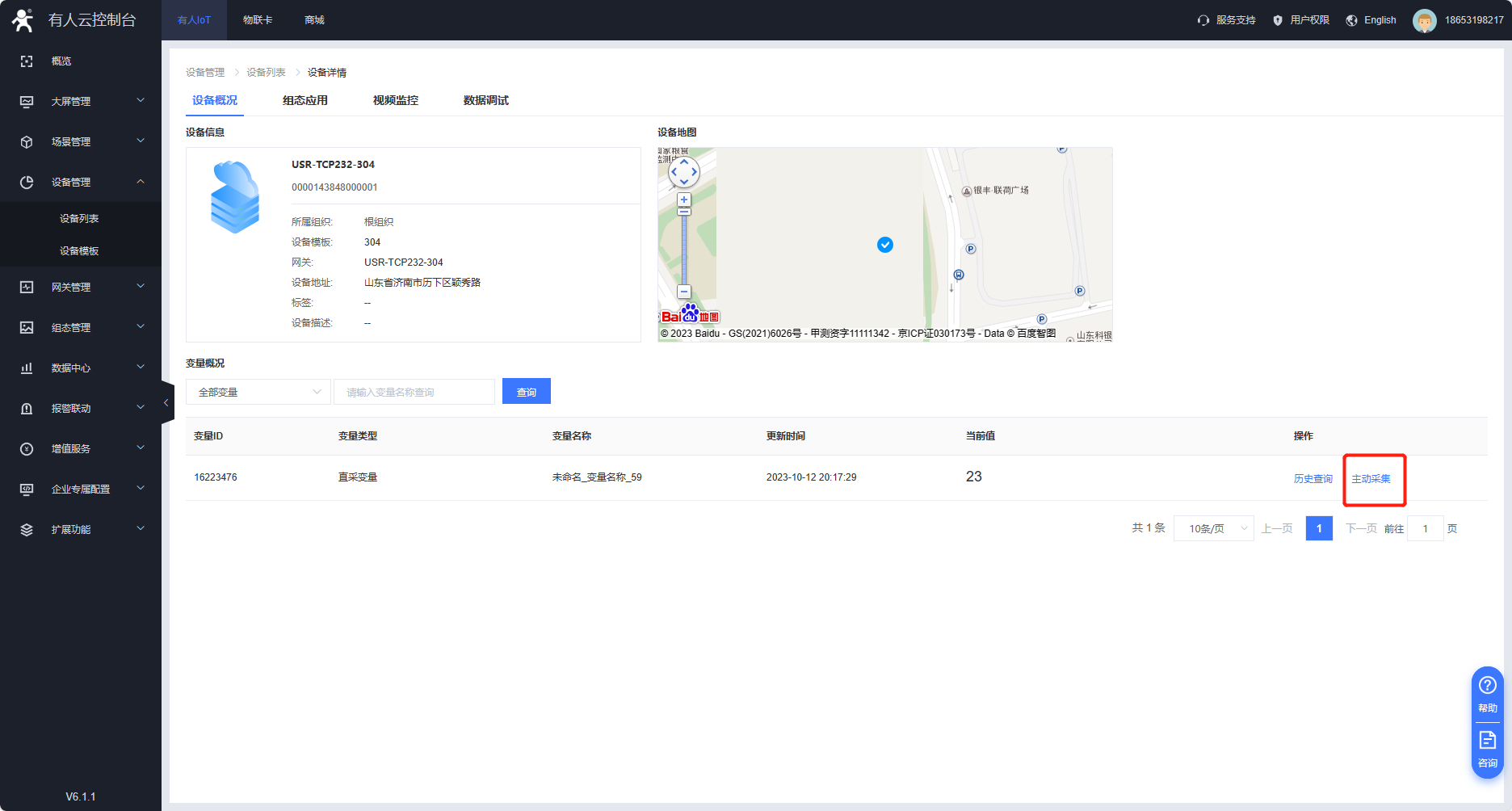 3、在有人云平臺上找到對應的設備,點擊數據查看-主動采集??梢栽谟腥嗽破脚_查看設備傳輸的串口數據。
