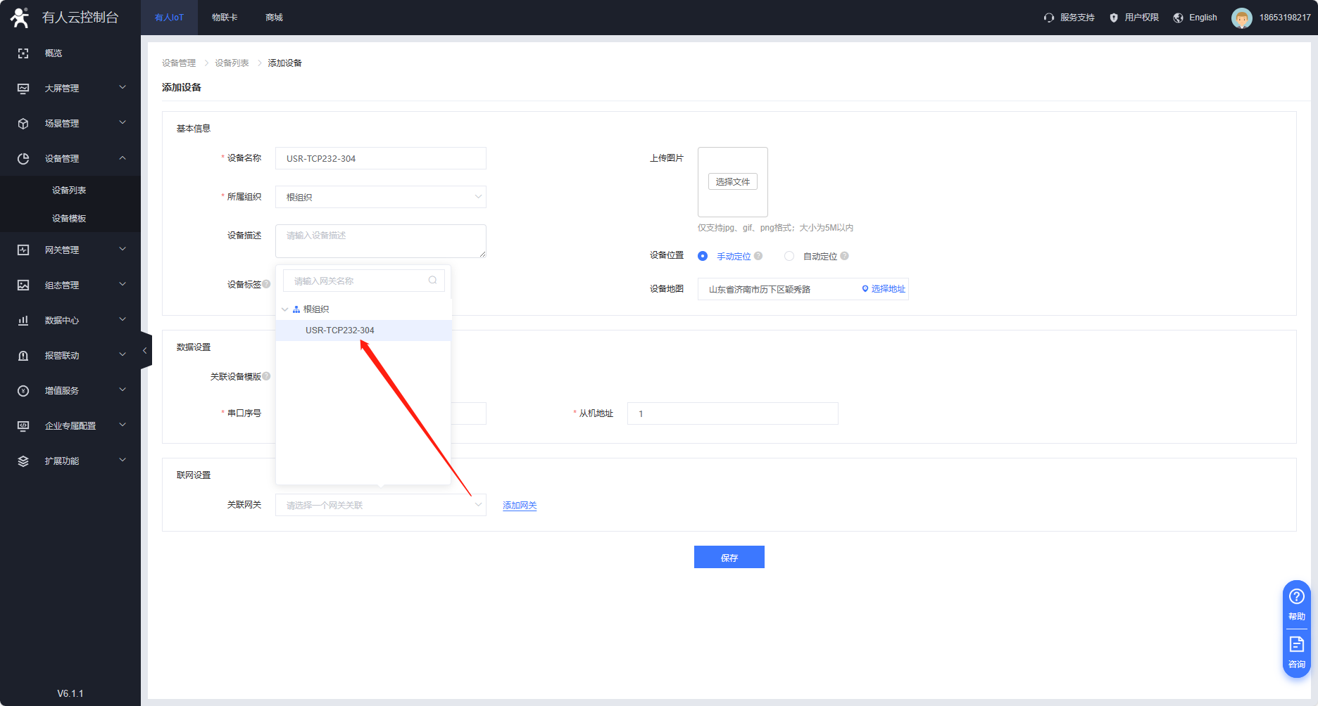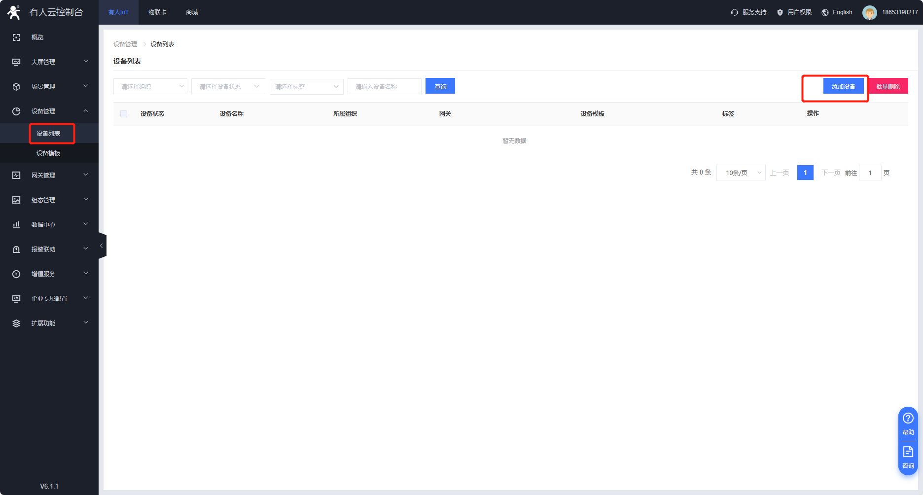 云平臺添加設備,在設備管理---設備列表--添加設備
