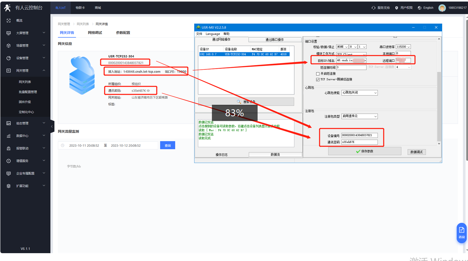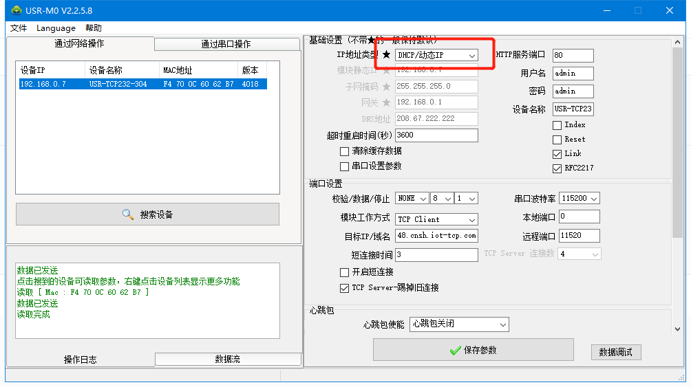 4、IP地址類型更改為DHCP/動態IP,設置完成后通過網線將304的網口接到路由器LAN口上面,給設備供網。工作方式選擇TCP Client,目標IP:自己的云平臺接入地址,遠程端口號:15000,設置完成后點擊保存參數。