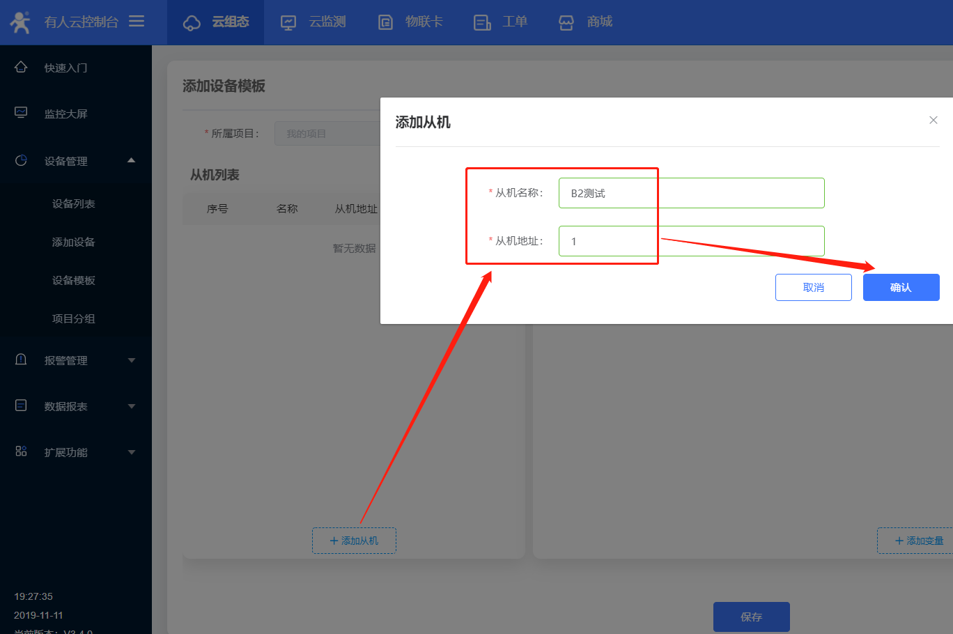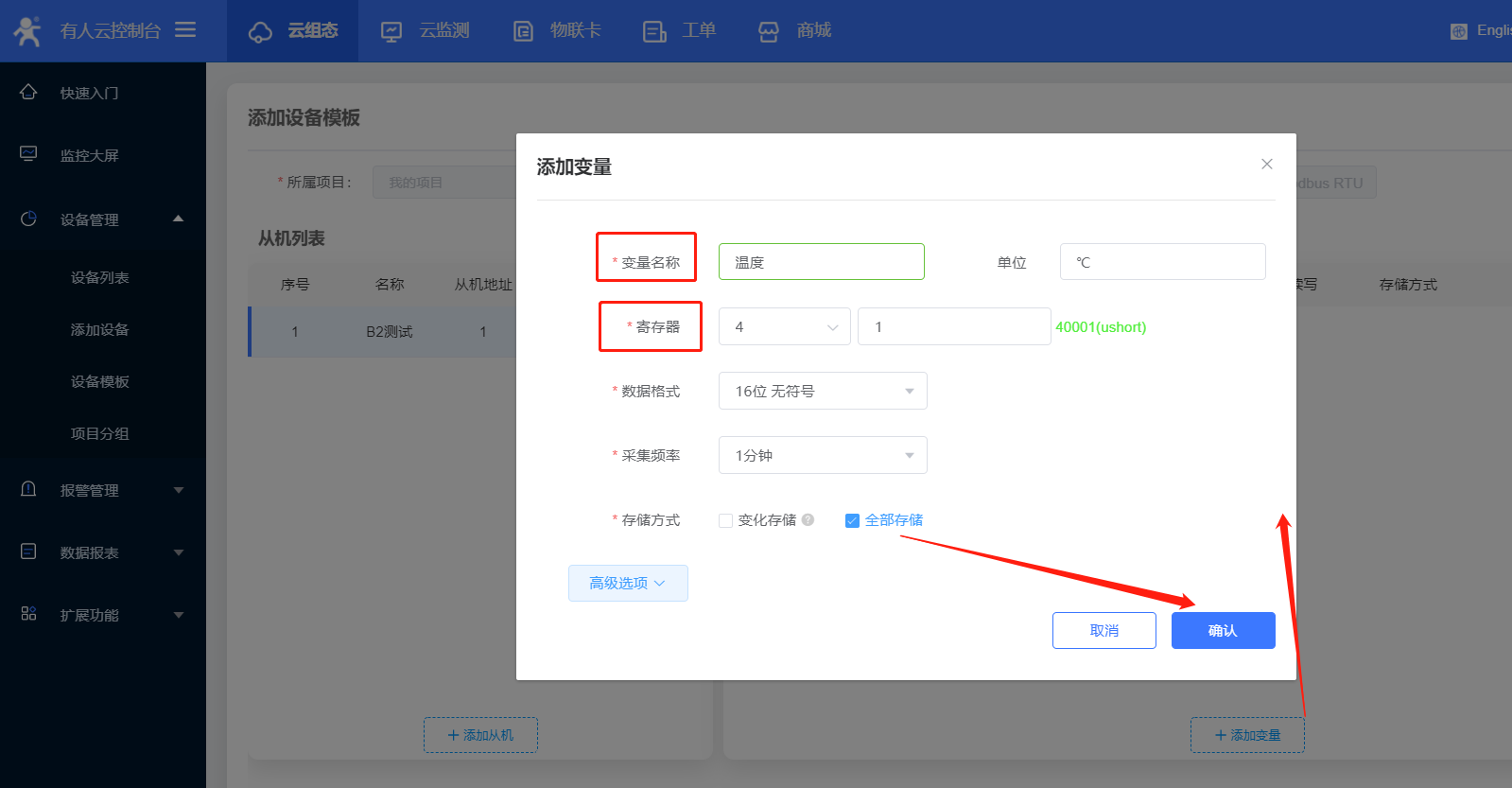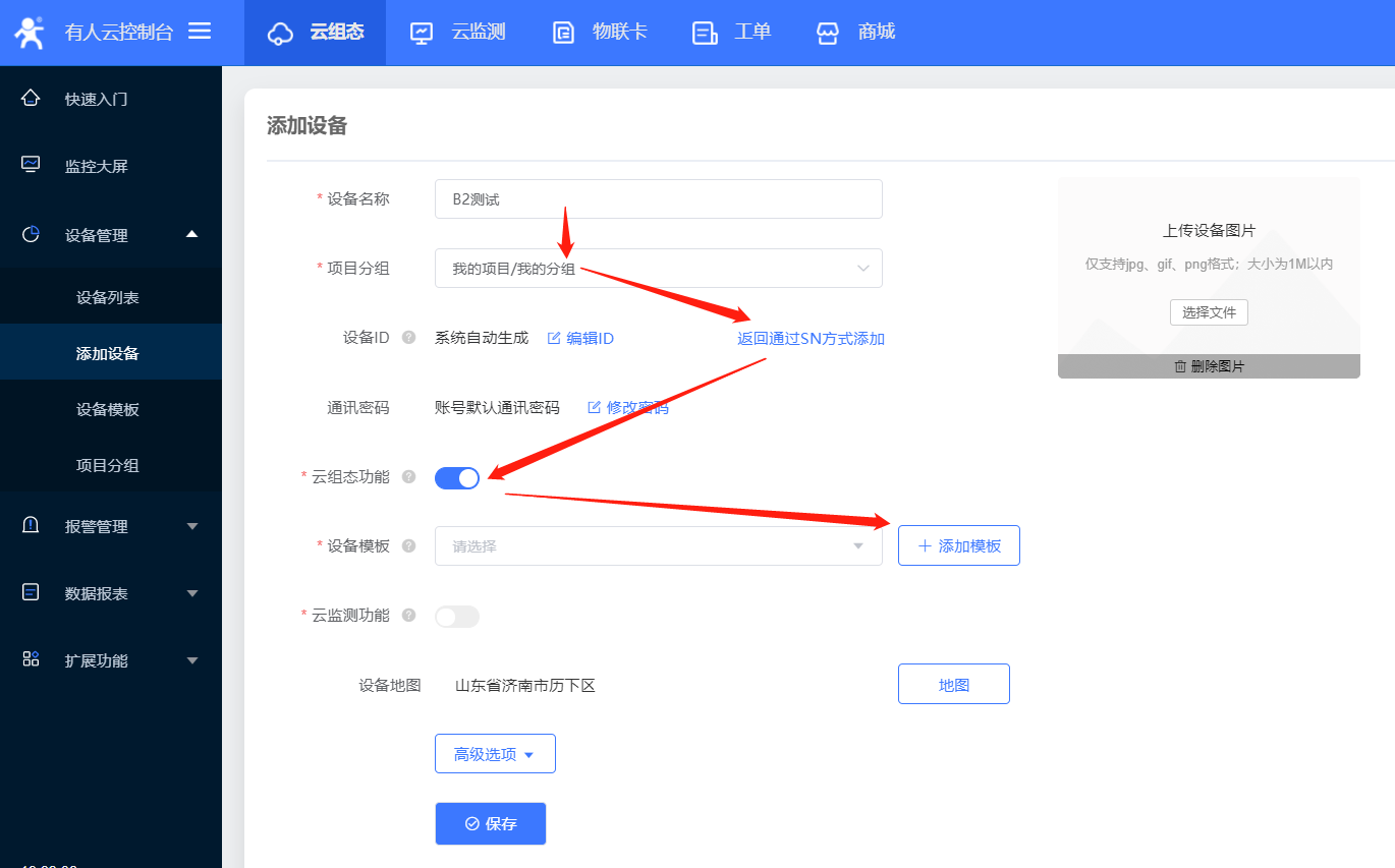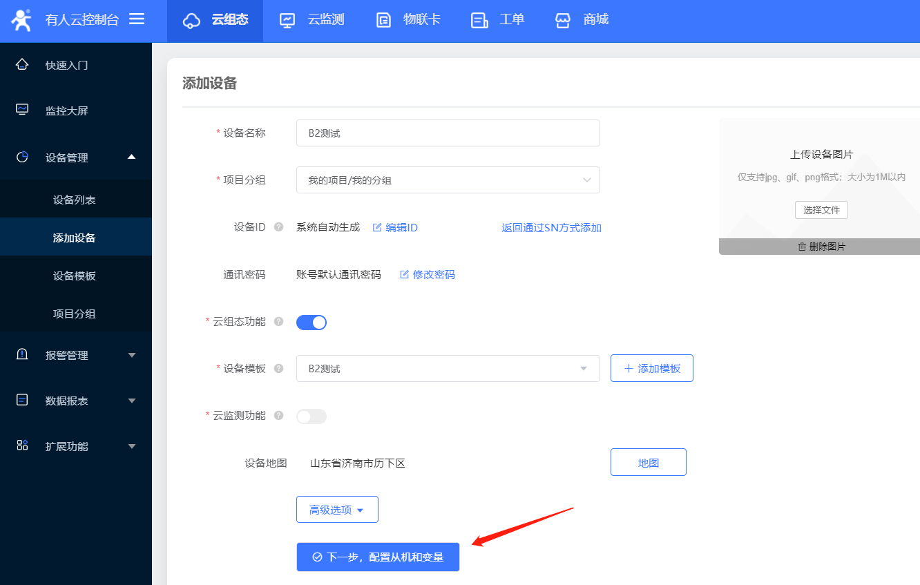 6、設置設備名稱,和項目分組,A2/B2目前只能使用ID方式添加設備id;設備id和密碼設置默認就可以,選擇云組態,添加數據模板;