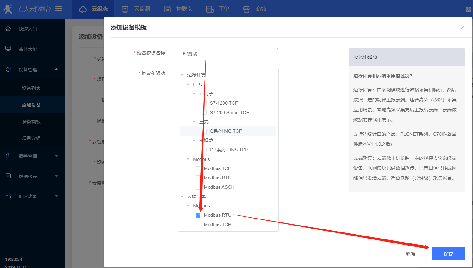 7、模板更改名稱,選擇modbus rtu協議,點擊保存