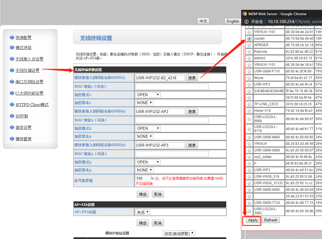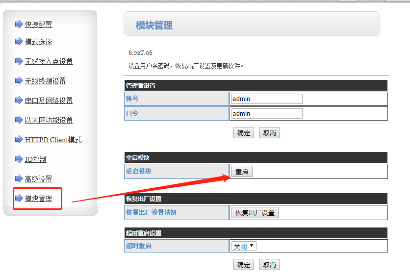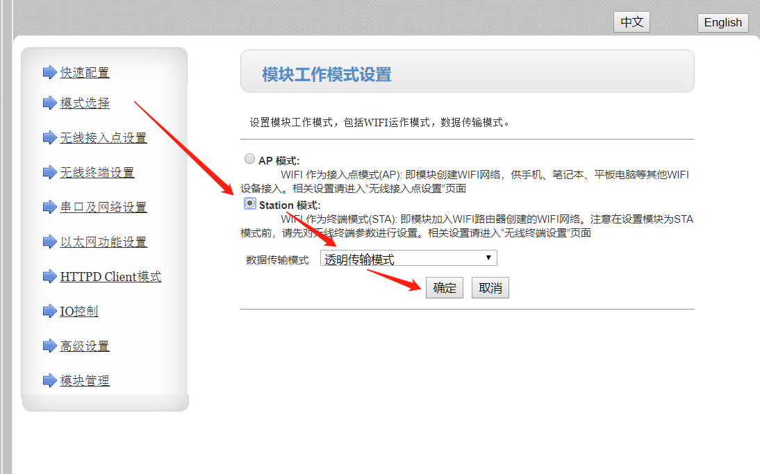 內置網頁的賬號和密碼都是admin,進入以后選擇模式選擇模式選擇為sta模式,點擊確定;(先不要重啟,等設置完所有的參數再重啟設備)