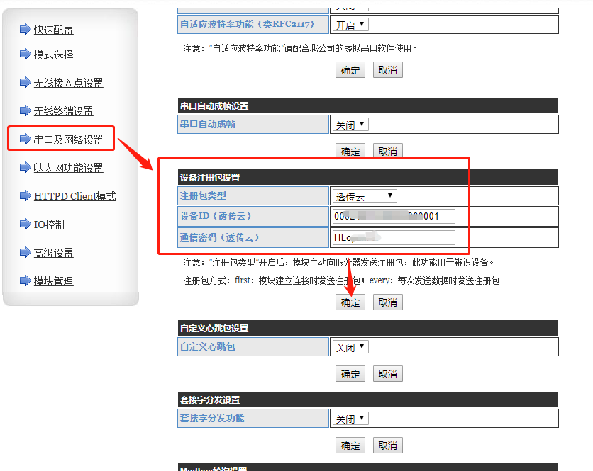 14、進入到串口及網絡參數設置,串口參數設置為和您終端設備的串口參數一致。注冊包選擇透傳云,填上透傳云上新建立的設備id,和密碼(如下圖所示),點擊保存