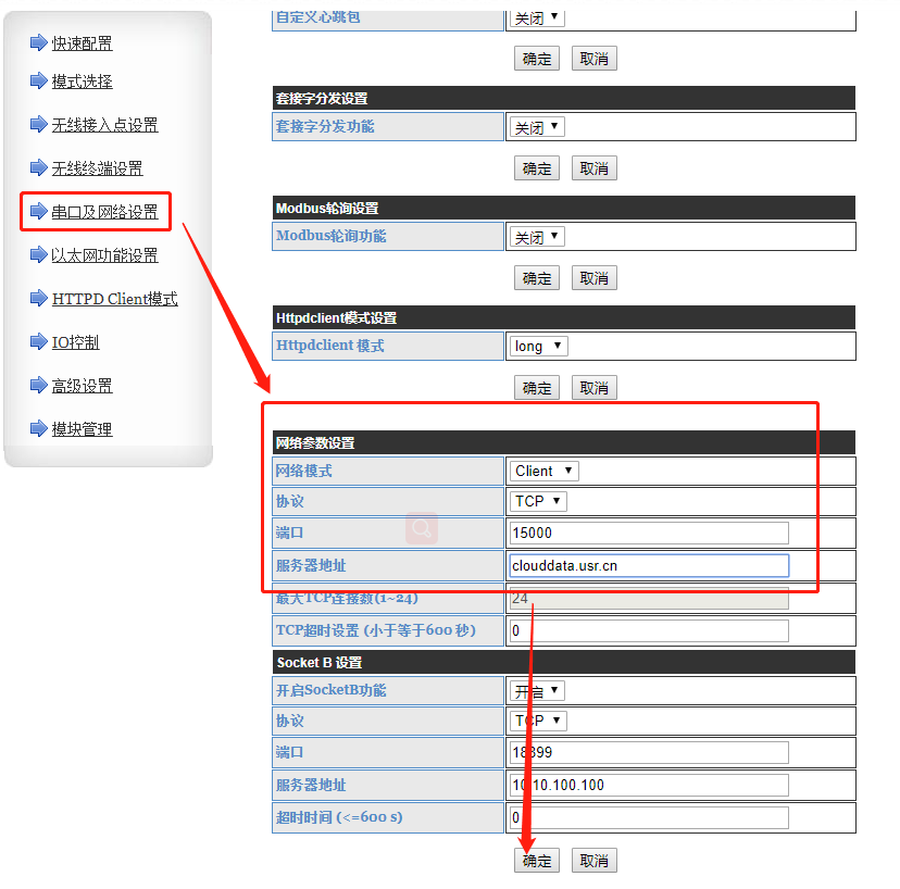 15、在串口及網絡參數中的網絡設置上設置為Tcp Client,透傳云的域名為clouddata.usr.cn,透傳云的端口為15000,設置完點擊保存;
