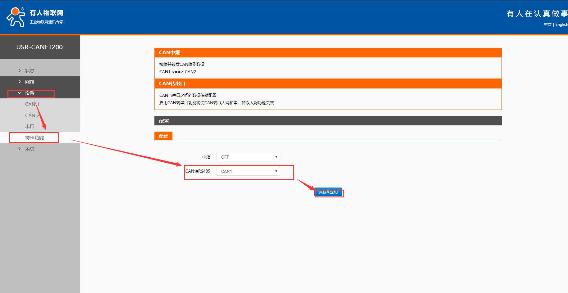 2. 瀏覽器輸入地址192.168.0.7,進入canet200的內(nèi)質(zhì)網(wǎng)頁,選擇設置->特殊功能->can轉(zhuǎn)485->打開can1,如圖所示,然后重啟。