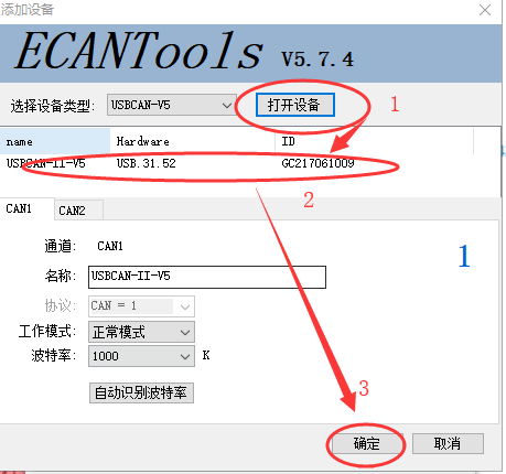 選擇設備類型為“USBCAN-V5”然后打開設備選擇Can1,點擊確定