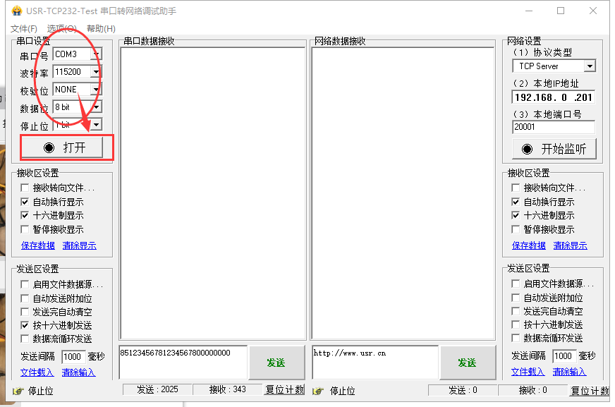 4. 打開USR-TCP232-test串口轉(zhuǎn)網(wǎng)絡調(diào)試助手,左側(cè)選擇已連接的com口,波特率為115200,校驗位none,數(shù)據(jù)位8bit,停止位1bit,單擊打開。