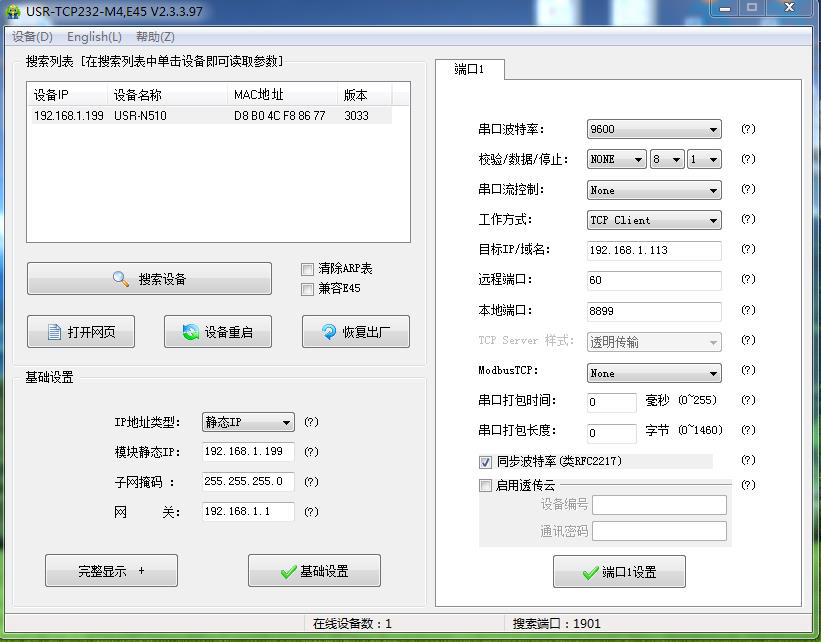串口服務器USR-N510網線和電腦直連,IP設置同網段,在電腦用M4設置軟件去搜索USR-N510的IP,設置USR-N510的參數,做TCP client。遠程服務器地址填電腦IP,遠程端口填電腦server端口。
