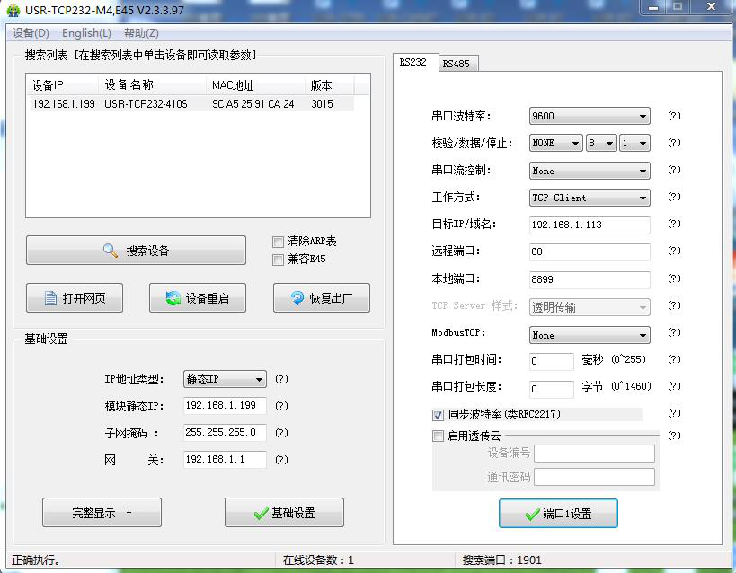 USR-TCP232-410S網線和電腦直連,IP設置同網段,在電腦用M4設置軟件去搜索USR-TCP232-410S的IP,設置USR-TCP232-410S的參數,做TCP client。遠程服務器地址填電腦IP,遠程端口填電腦server端口。