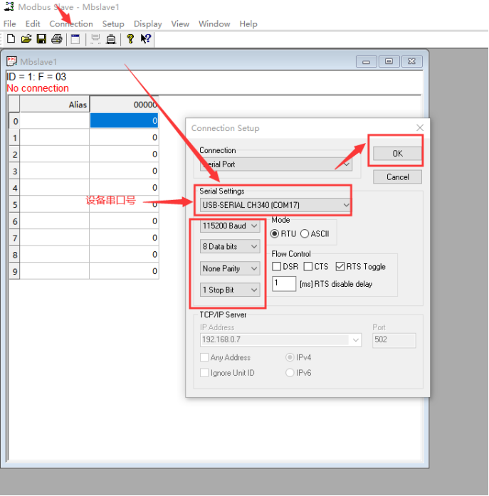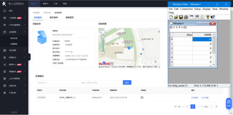 1、本次測試用modbus slave模擬,從機號1,功能碼03,W600設置與之一致的串口參數,在對應的寄存器填寫一個數值,本次測試數值寫入33.