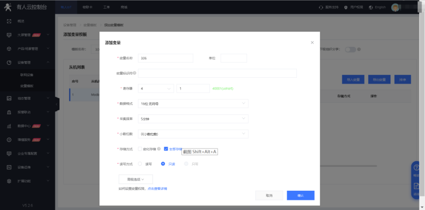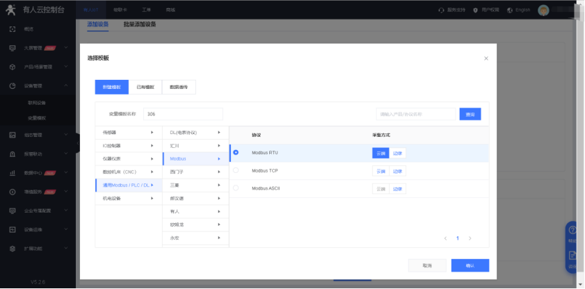 1、注冊有人云賬號,登陸,有人云網址:https://account.usr.cn/mp_scada,在設備管理的界面添加聯網設備。并添加對應的MODBUS云端輪詢模板。點擊保存查看有人云平臺生成的設備編號以及密碼。