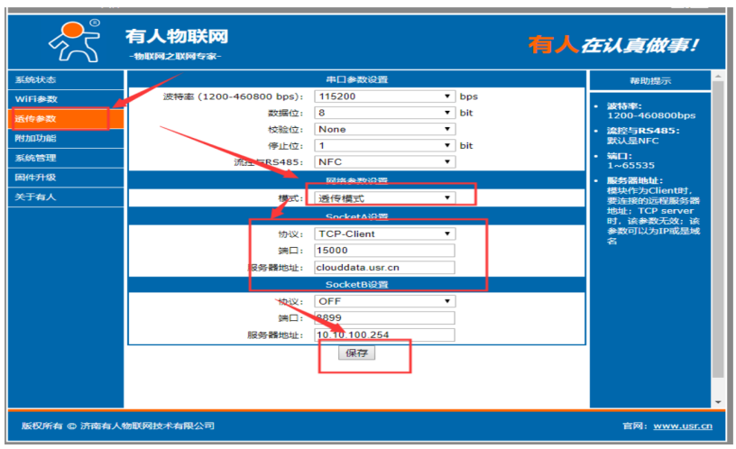 1、電腦鏈接w610的WiFi,在瀏覽器中輸入設備默認的ip:10.10.100.254進入內置網頁。內置網頁的賬號密碼都是admin。進入透傳參數,選擇透傳模式,SOCKET A設置協議為TCP client 服務器地址:clouddata.usr.cn端口15000點擊保存
