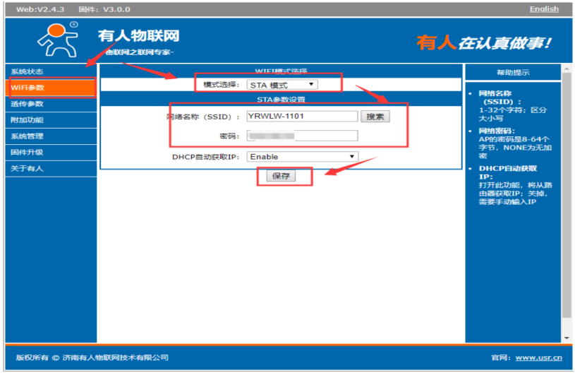 3、在wifi參數,進入以后選擇模式選擇模式選擇為sta模式,搜索需要連接的路由器的wifi,并填寫密碼。電腦也連接同一個路由器的wifi點擊保存。設置完所有的參數再重啟設備。設好所有參數后,在有人云平臺設備管理界面中可以看到設備在線。