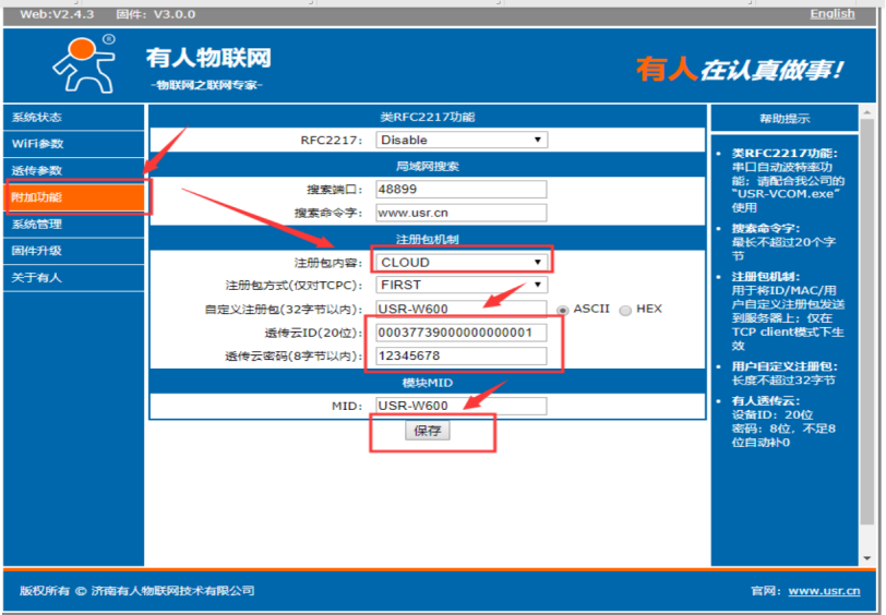 2、點擊附加功能,在注冊包機制界面設置注冊包內容:cloud,填寫有人云上添加設備后生成的設備id和密碼,點擊保存。
