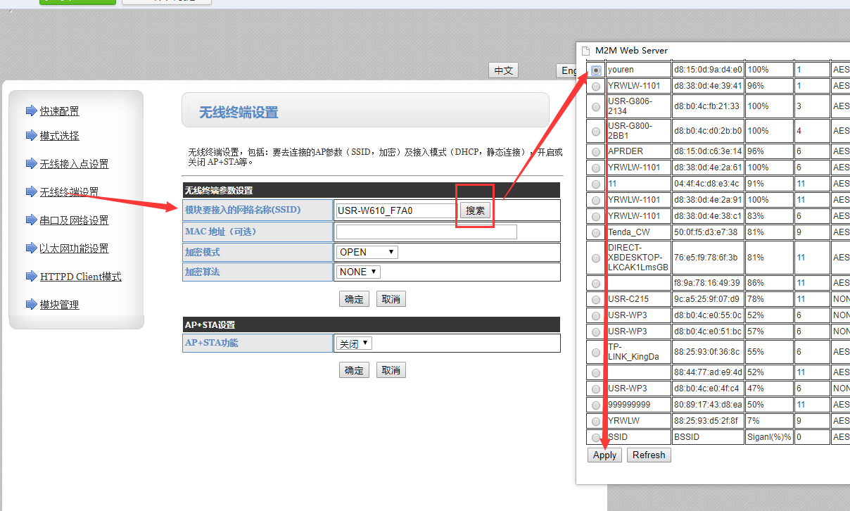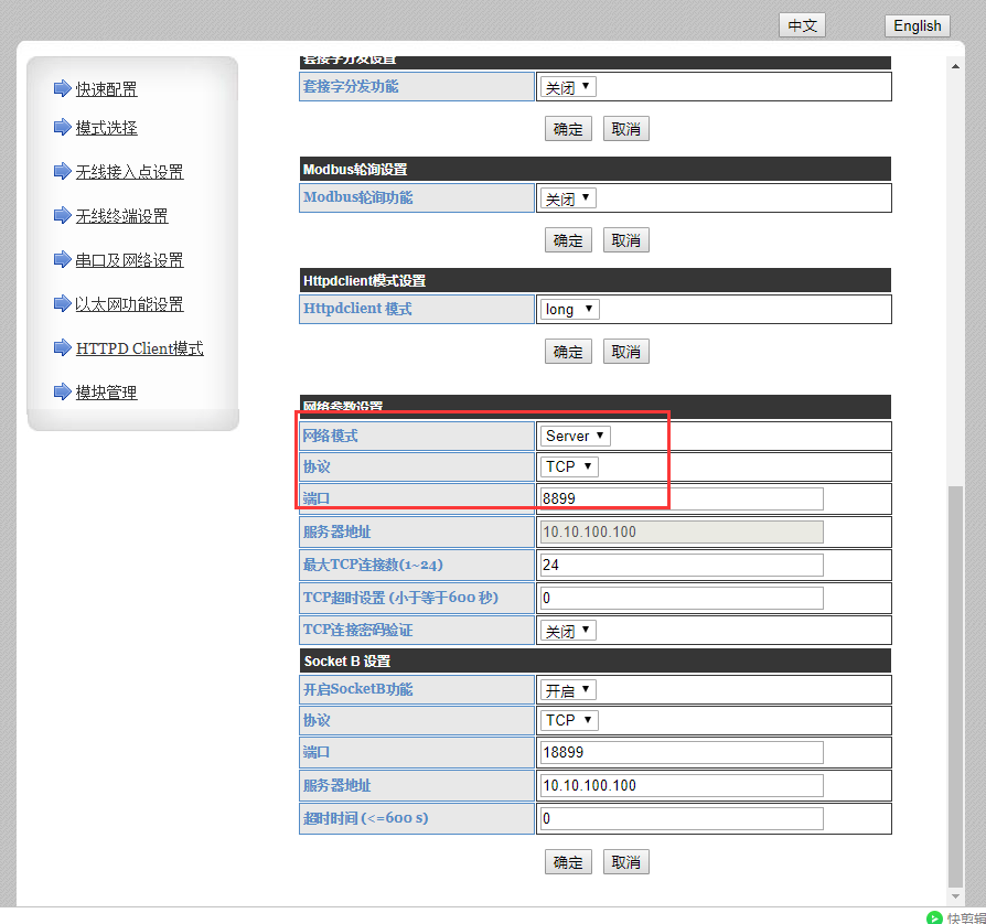4、模式選擇: STA,modbus rtu<=>modbus tcp協議轉換。 注:確定后,不用立刻重啟,等著全部修改完成一塊重啟。