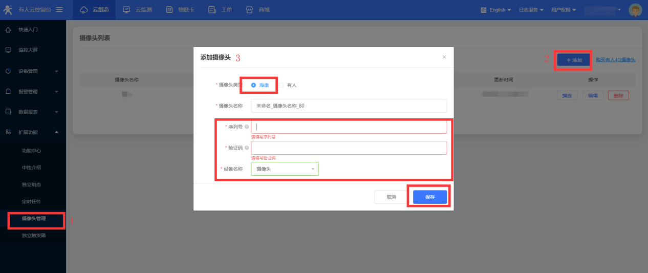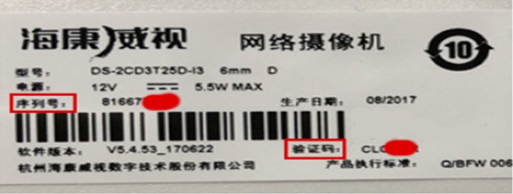 2、點擊添加鍵,選擇海康攝像頭,序列號為攝像頭機身上的9位序列號,驗證碼為攝像頭機身上的6位驗證碼,如下圖所示,保存
