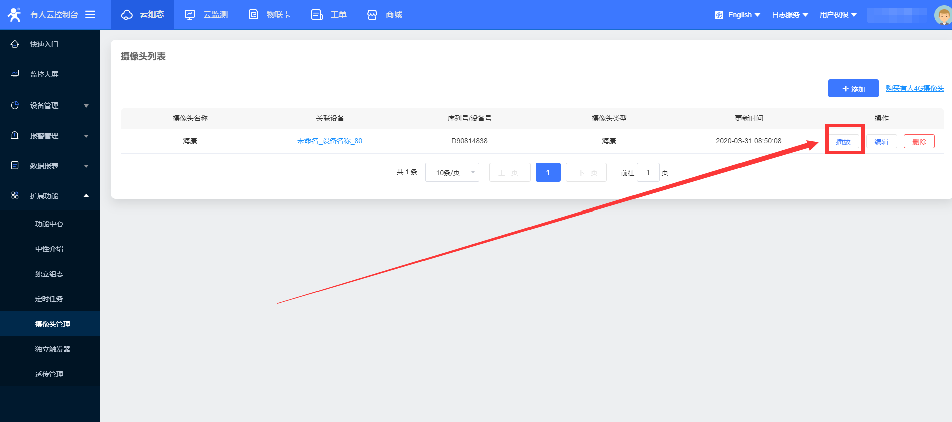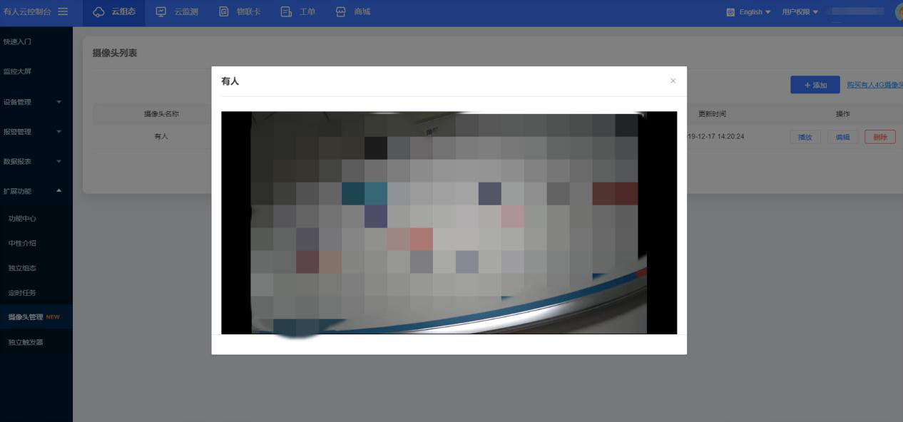1、在擴展功能的功能中心將攝像頭管理功能開通,左側列表生成該選項欄,點擊進入攝像頭管理