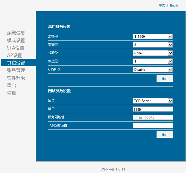 4:設置模塊工作方式為TCP server。 端口8899.