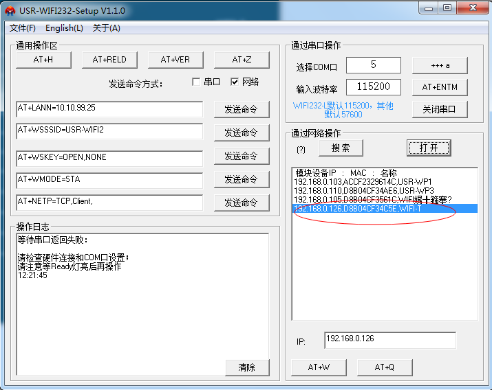 6:使用WiFi232-setup軟件,搜索WIFI 模塊在路由器上獲取到的IP地址。在路由器的路由客戶端列表查詢模塊分配的IP。