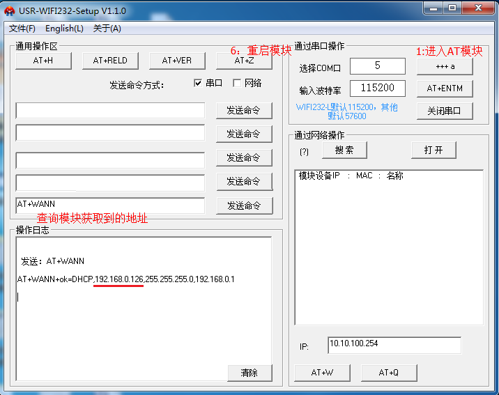 9:使用AT指令設置模塊加入路由器的步驟詳解:使用AT+WANN可以查詢到模塊獲取到的IP地址。通信地址就使用這個IP,該指令要在模塊設置以上指令重啟之后,再去使用這個指令才能生效。