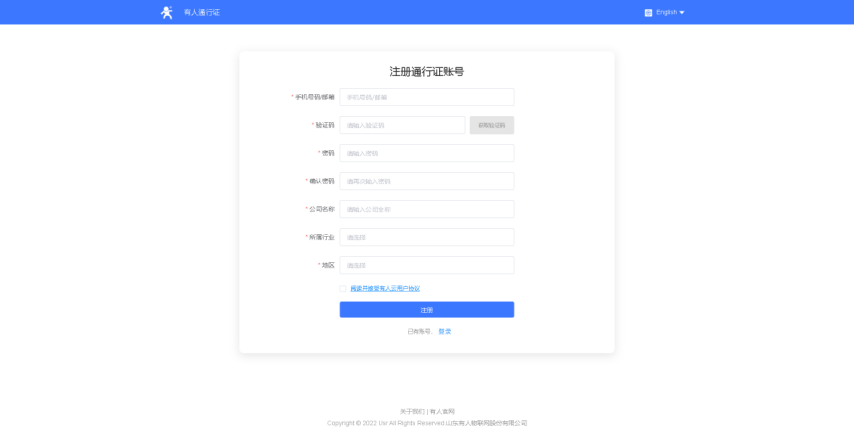 5、打開有人云網頁:http://cloud.usr.cn/ 點擊右上角注冊,根據主賬號中填寫的手機號或者郵箱給子賬號注冊有人云通行證。