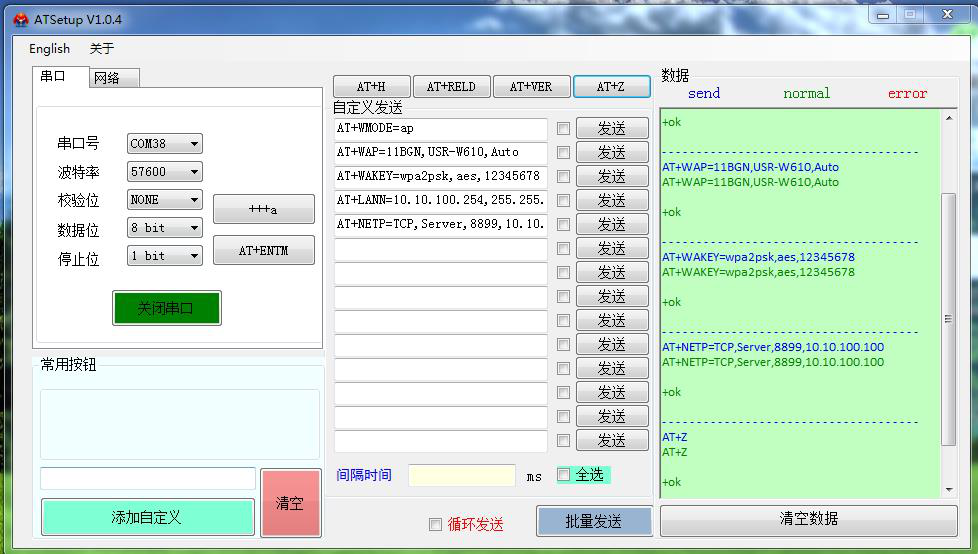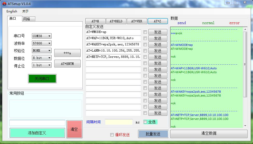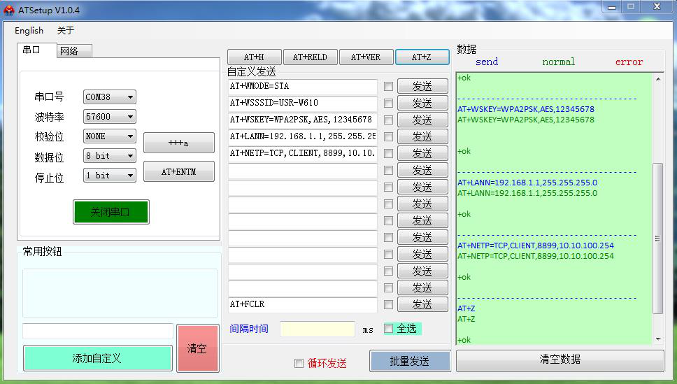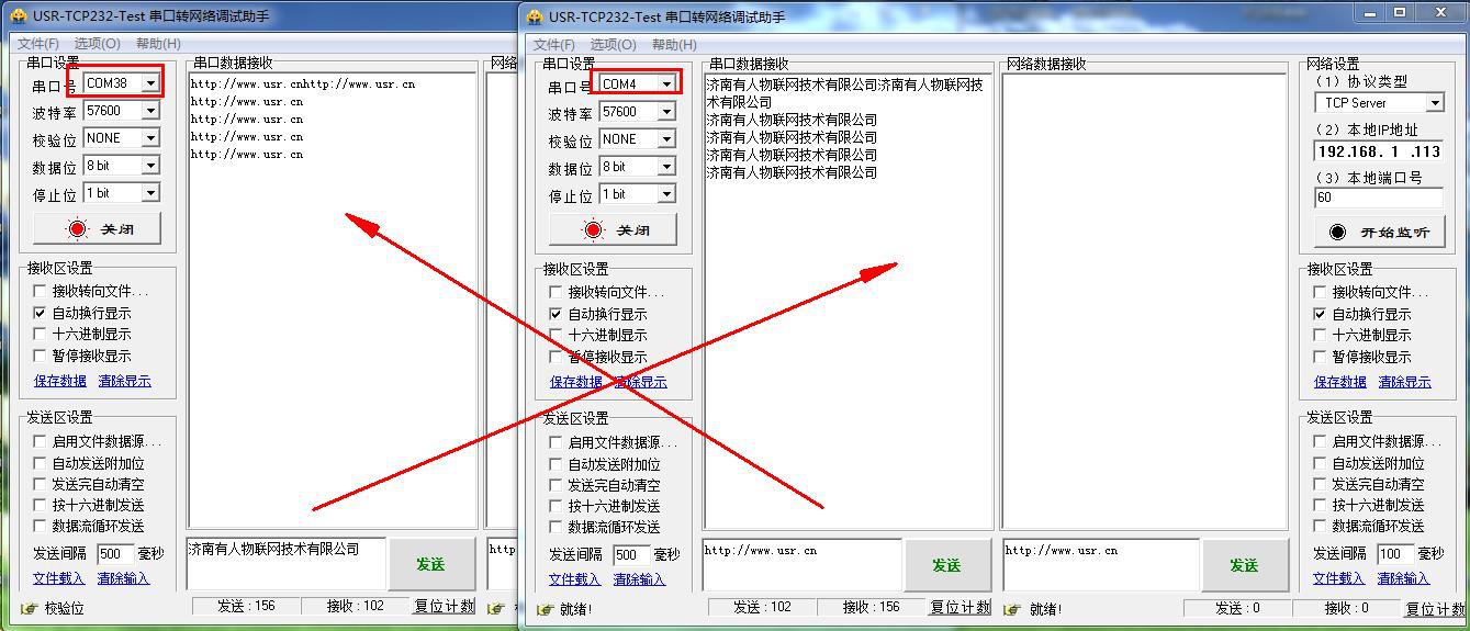 在電腦上用USR-TCP232-TEST軟件測試,分別打開對應的兩個COM口,測試兩個串口之間相互傳輸數據。