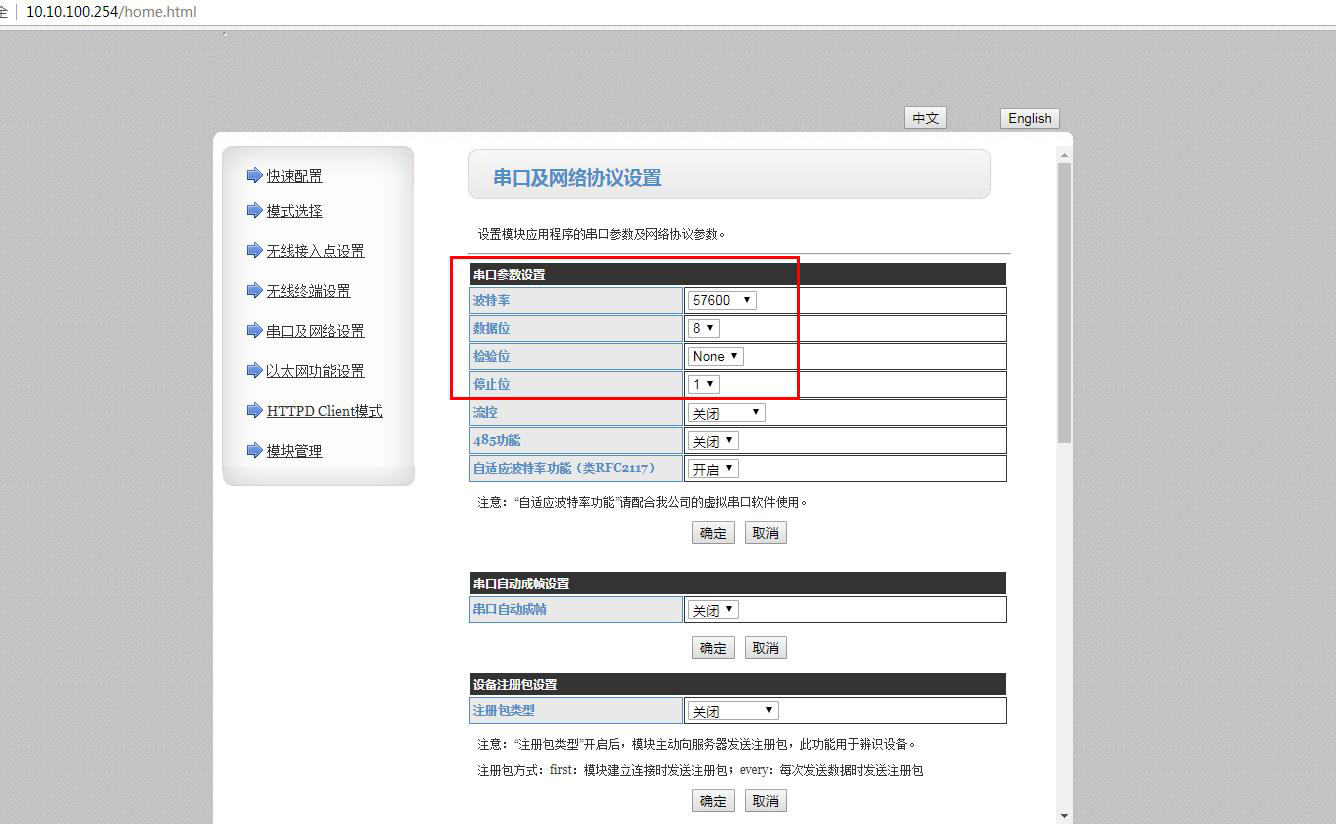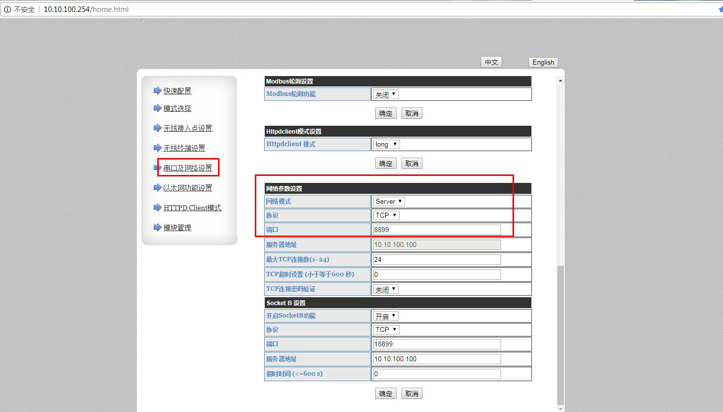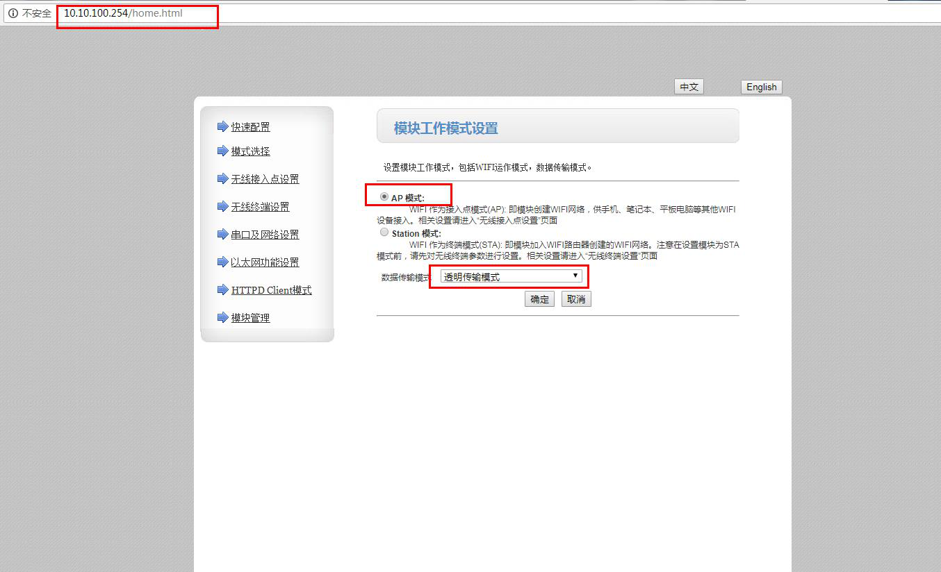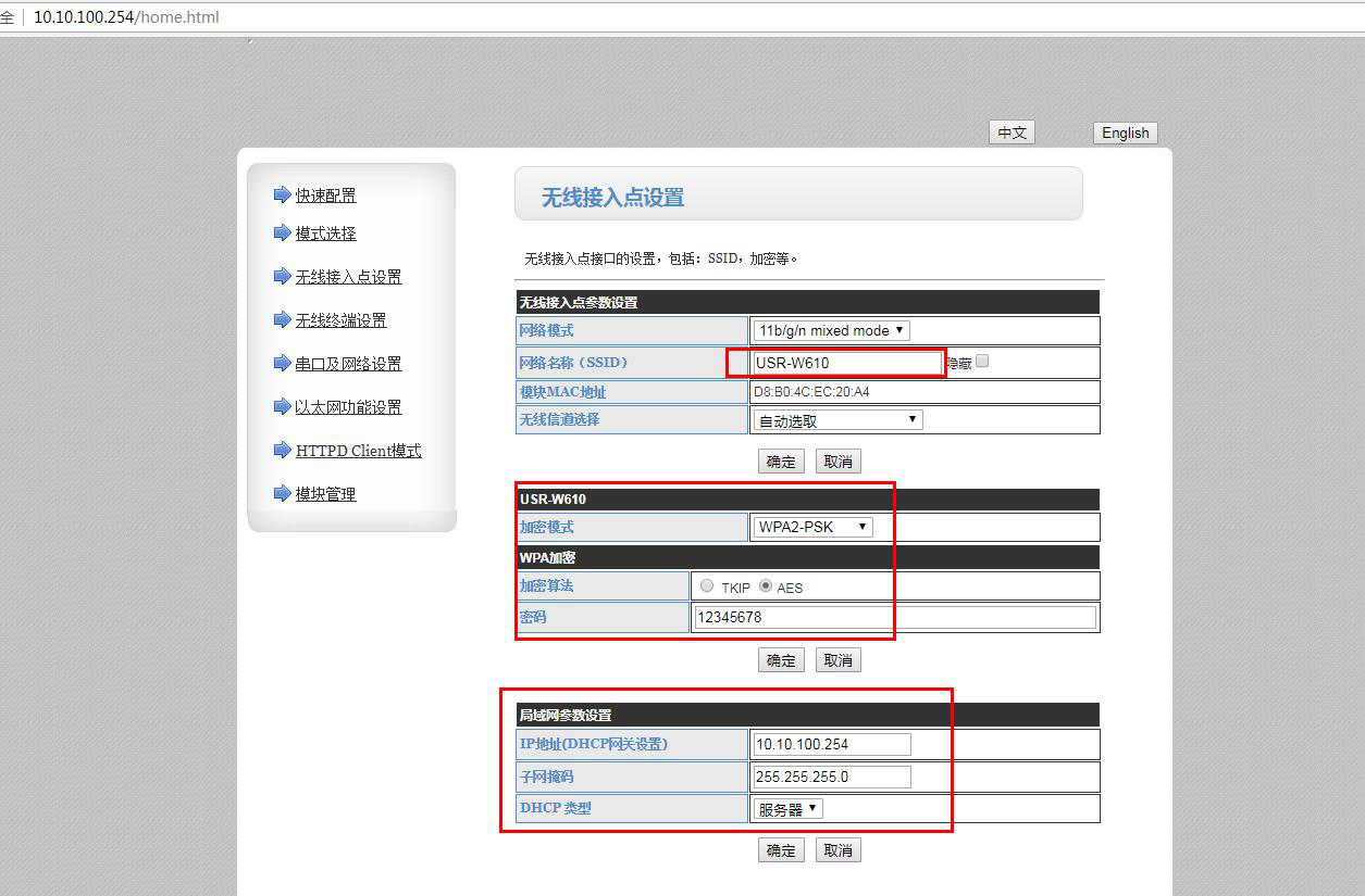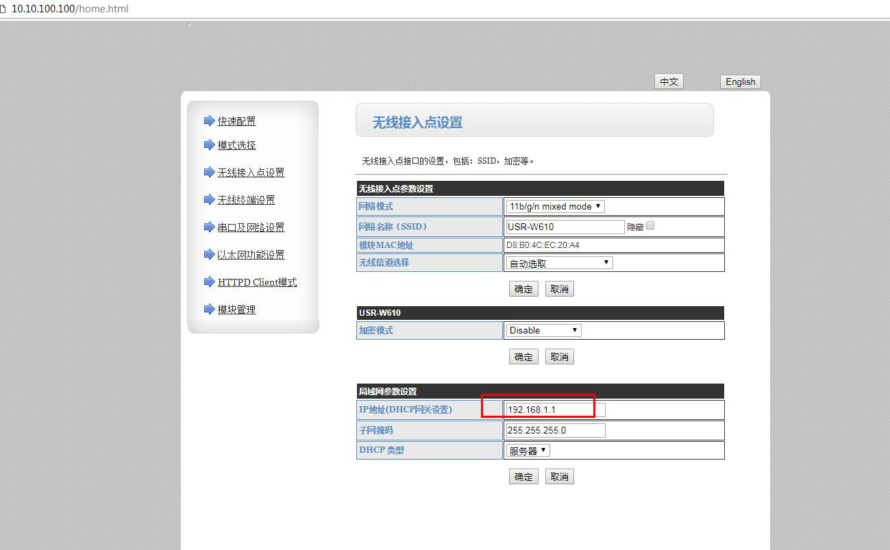 1號USR-W610設置AP模式,工作模式設置TCP server。