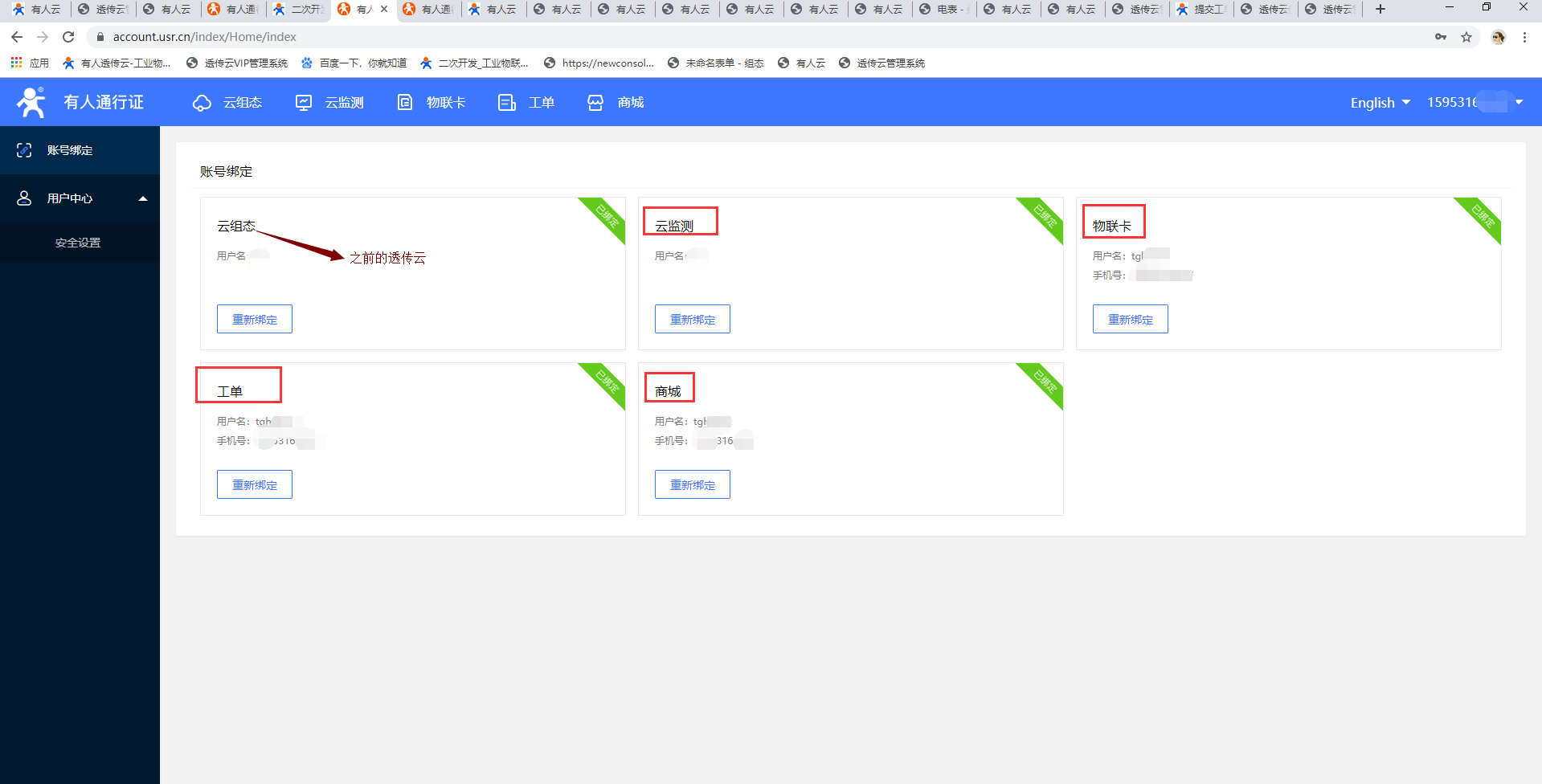 4、可以重新創建云組態,如果以前使用過透傳云可以直接綁定透傳云的賬號,由此界面綁定物聯網卡平臺,工單系統,云監測,和商城;