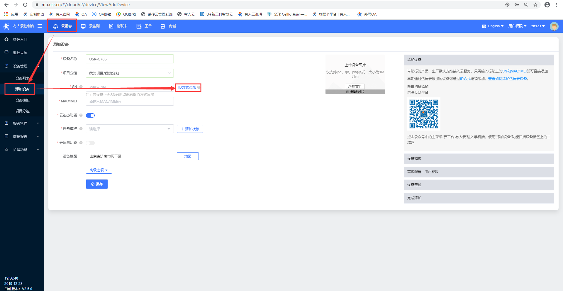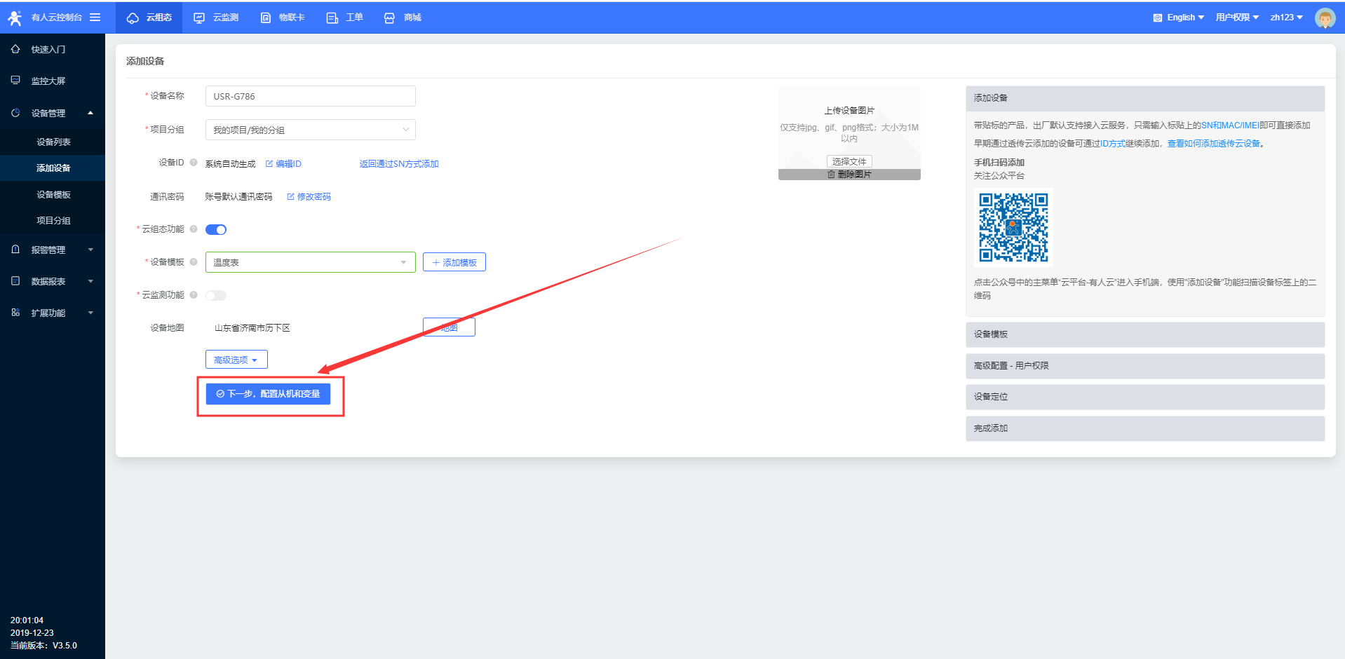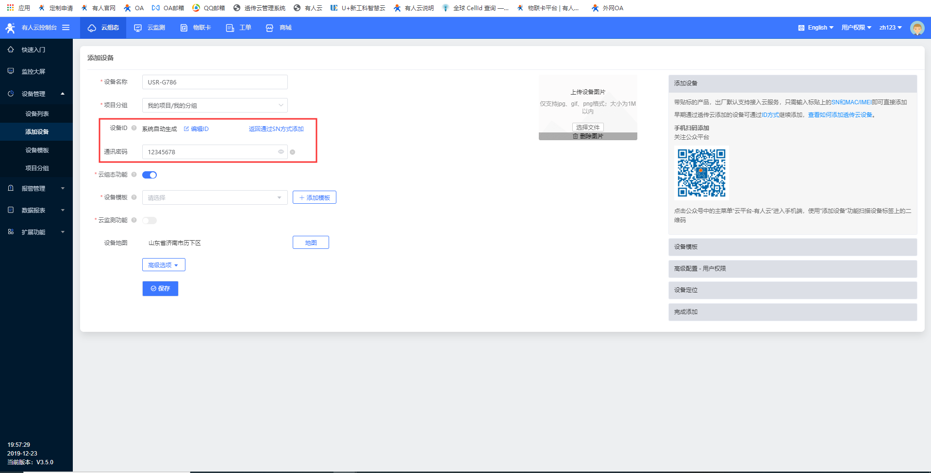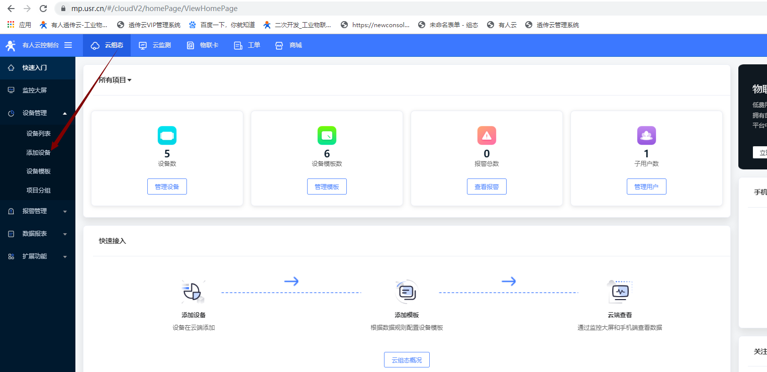 5、本次案例是USR-G786透傳模式連接有人云進行數據顯示,可以進入云組態,選擇添加設備;