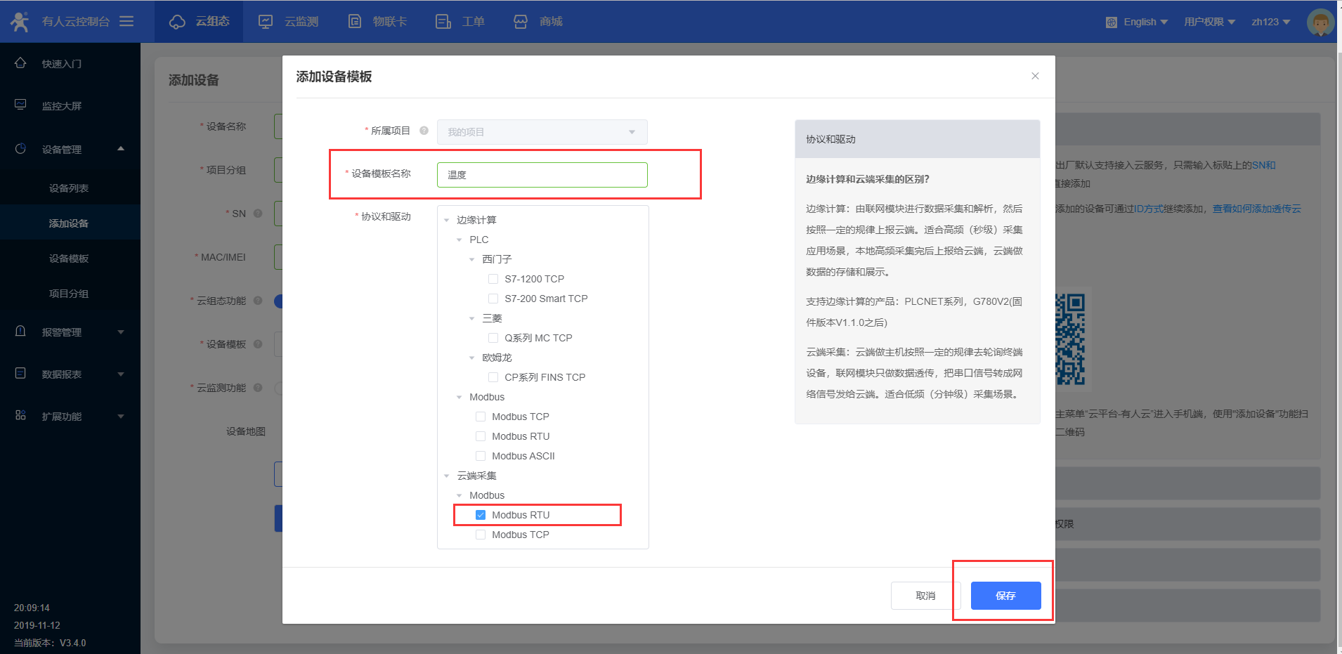 7、點擊添加模板,設備模板根據需要自行編輯名稱,選擇Modbus RTU協議,點擊保存;