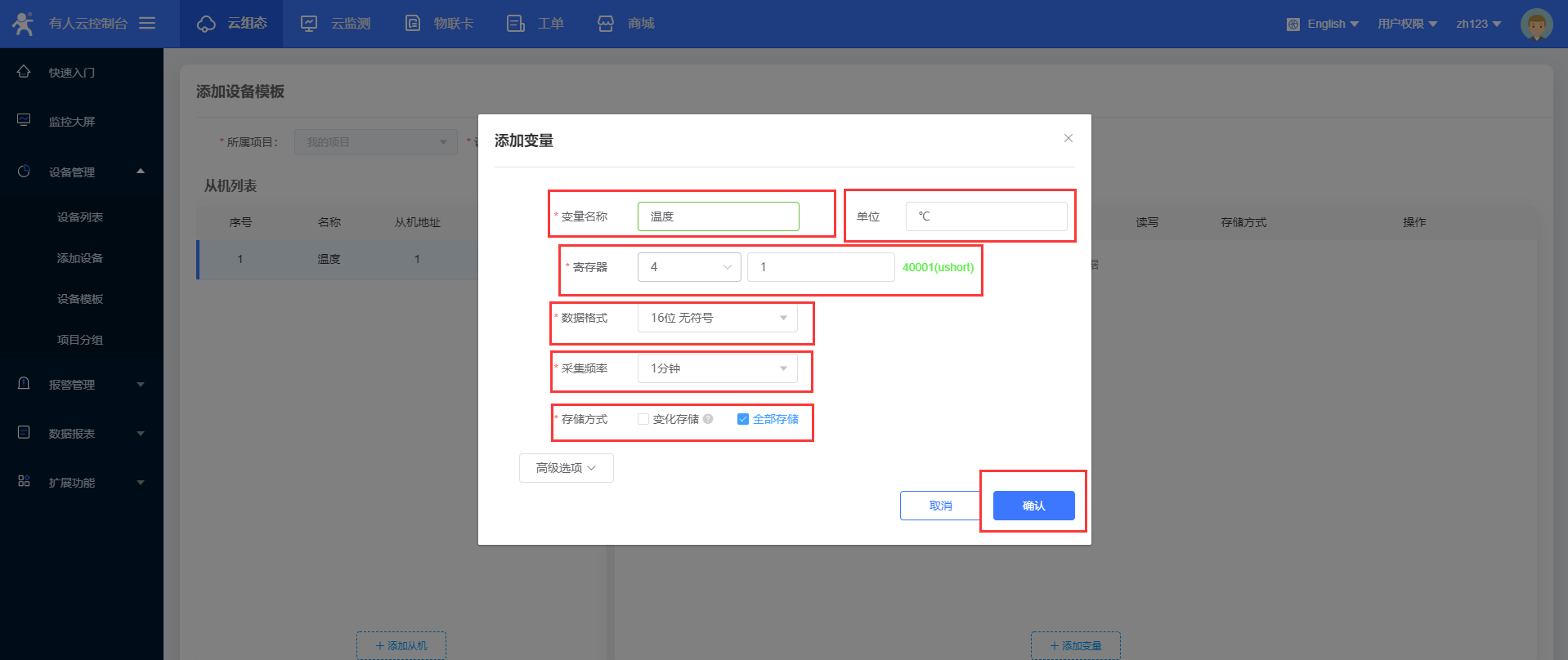 10、點擊添加變量,設置變量的名稱,寄存器地址,數據格式,采集頻率(最低只能是一分鐘);