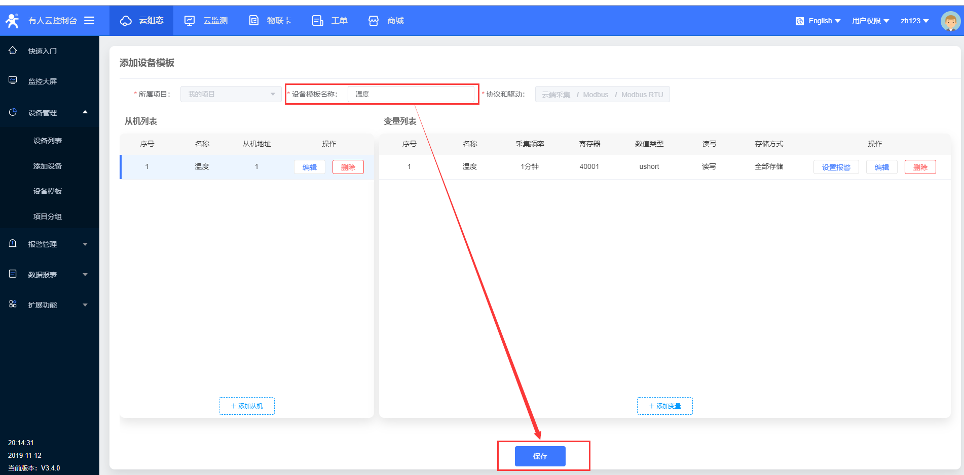 11、設置完從機和變量,根據需要設置一下模板名稱,點擊保存;
