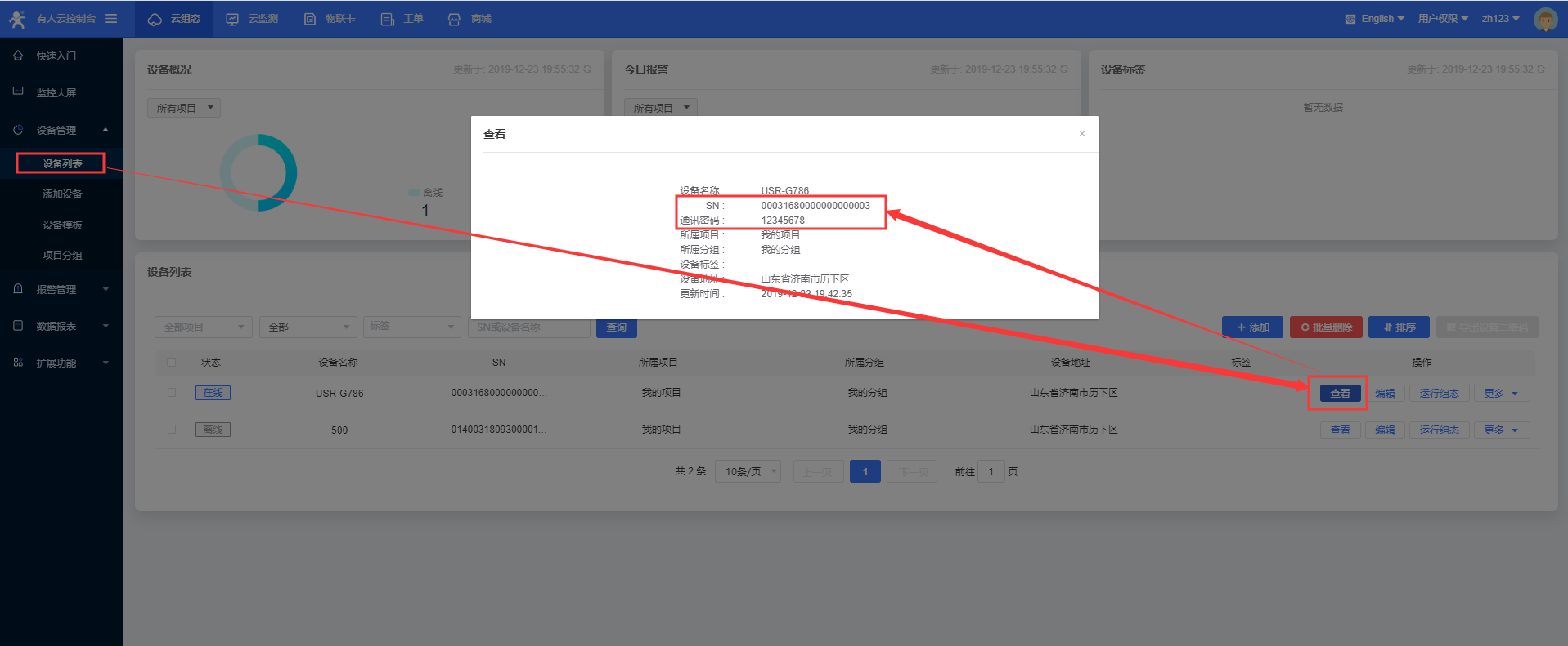 12、添加完設備,可以在設備列表看到剛剛添加的ID和密碼(下面要用到);