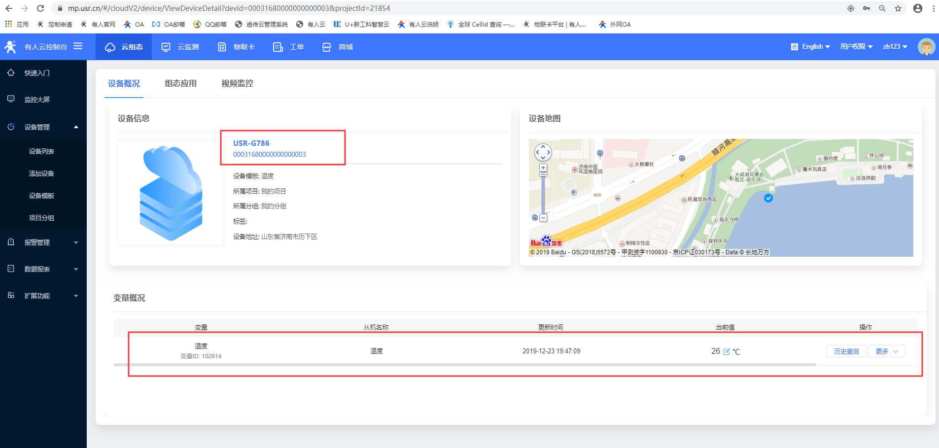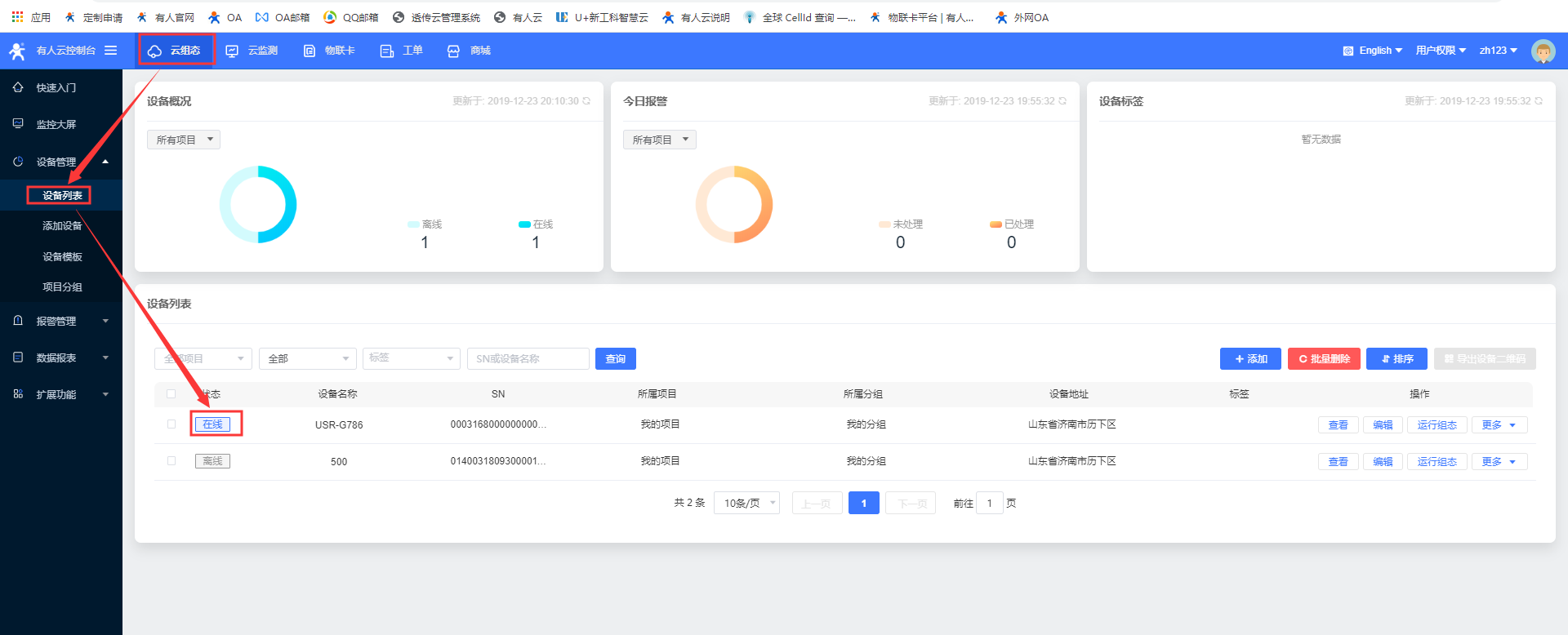 14、等待設備重啟以后,在有人云界面就可以看到USR-G786上線;