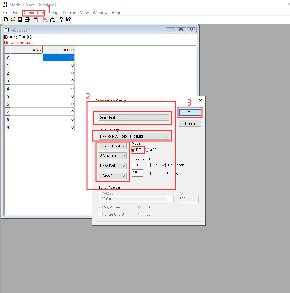 說明:用Modbus Slave軟件模擬Modbus RTU協議的串口設備;