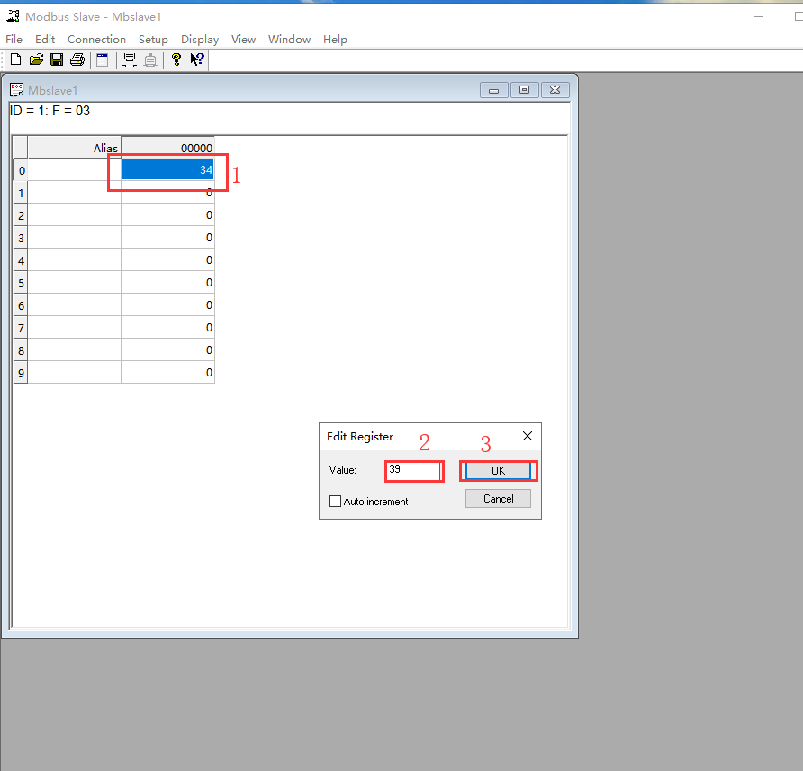 17、在Modbus Slave文本框中輸入模擬的溫度數據,點擊OK;