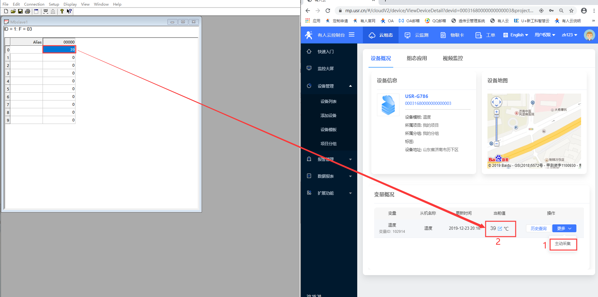 18、在有人云界面點擊主動采集,即可立即采集到對應的溫度數據(若設備模板設置主動采集,則有人云會按照采集頻率主動下發采集指令,本案例設置采集頻率為1分鐘);