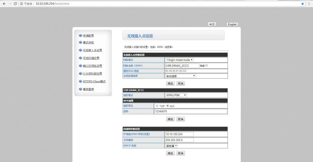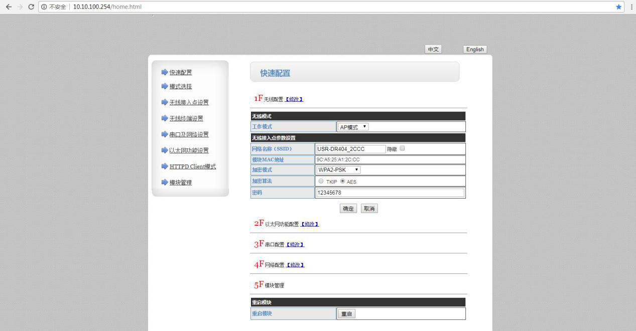 USR-DR404默認IP是10.10.100.254,用這個IP,在瀏覽器輸入,進入USR-DR404的內置網頁,可以對DR404進行參數查看和參數配置。登錄用戶名和密碼都是admin。